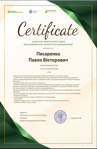 - Булат Віктор Євгенович, тема роботи – « Оцінка впливу на водні об’єкти лісогосподарської діяльності Філії «Уманське лісове господарство» ДП «Ліси України» (керівник - Писаренко П.В.);