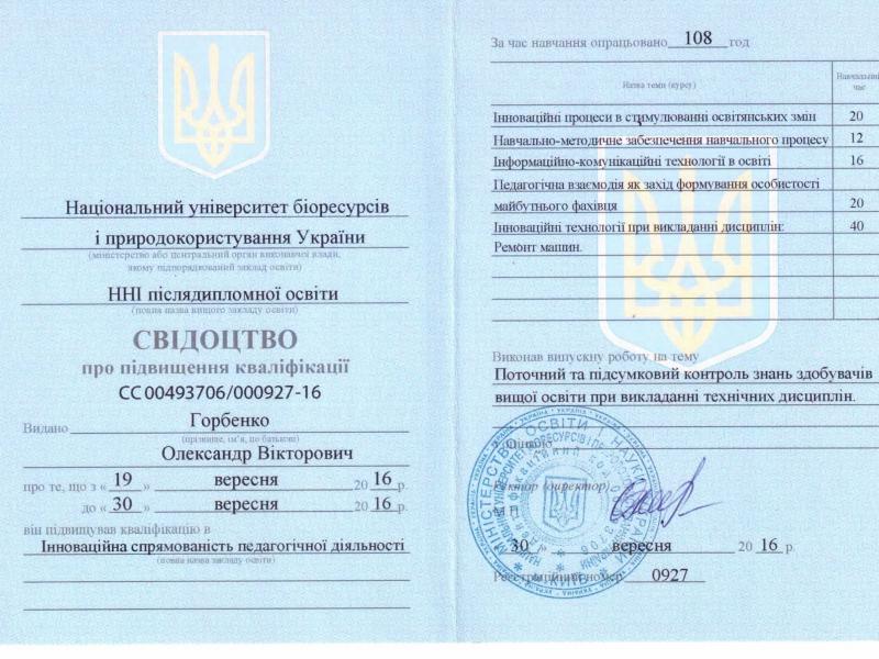 – 19.09.2016 – 30.09.2016 рр. – підвищення кваліфікації за напрямком «Інноваційна спрямованість педагогічної діяльності», 3 кредити ЄКТС, ННІ післядипломної освіти Національний університет біоресурсів і природокористування України, свідоцтво про підвищення кваліфікації СС 00493706/000927-16.