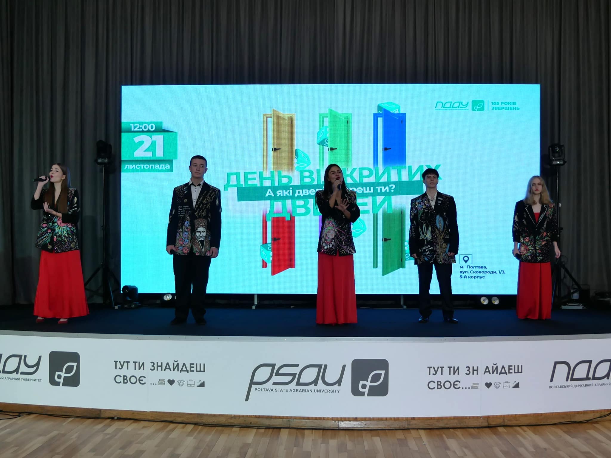 Про те, чому варто обрати ПДАУ, гостям розповіла голова студентського Сенату Юлія Даровська та фахівець з профорієнтації Даніїл Брашован. Вони підкреслили, що наші студенти, крім відвідування пар, чудово відпочивають і займаються творчістю. Офіційну частину заходу доповнили яскраві виступи творчих колективів ПДАУ — Народного ансамблю сучасної пісні «MAL-A-НIT», Народного аматорського колективу сучасного естрадного танцю «A.D.V.A.N.C.E.» та збірної ПДАУ з гумору «СВІТЛО».
