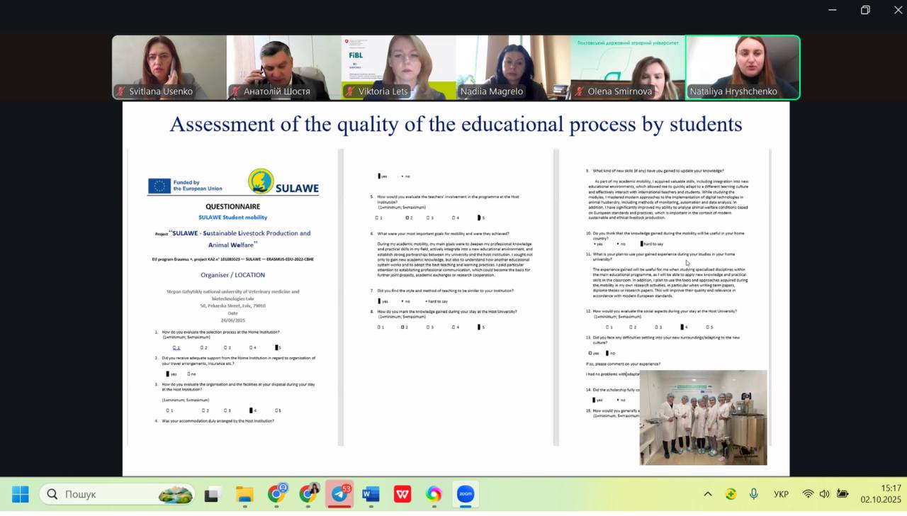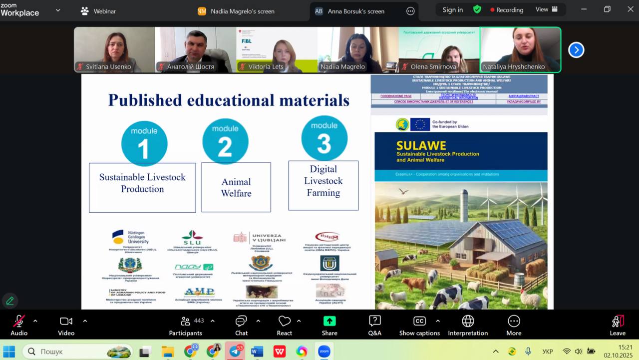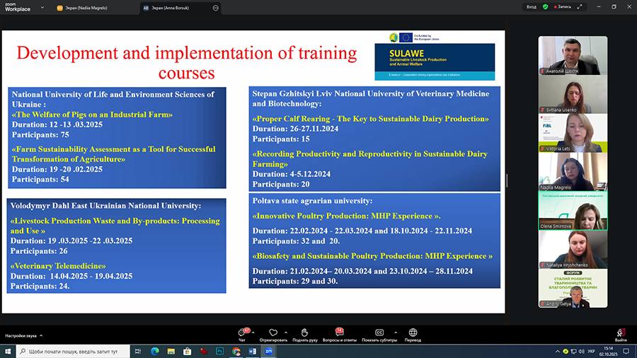 Надія Магрело (Львівський національний університет ветеринарної медицини та біотехнологій імені С. З. Гжицького), Олена Смірнова (Полтавський державний аграрний університет) та Наталія Грищенко (Національний університет біоресурсів і природокористування України), які презентували результати фінансованого ЄС освітнього проєкту SULAWE «Стале тваринництво та благополуччя тварин»;