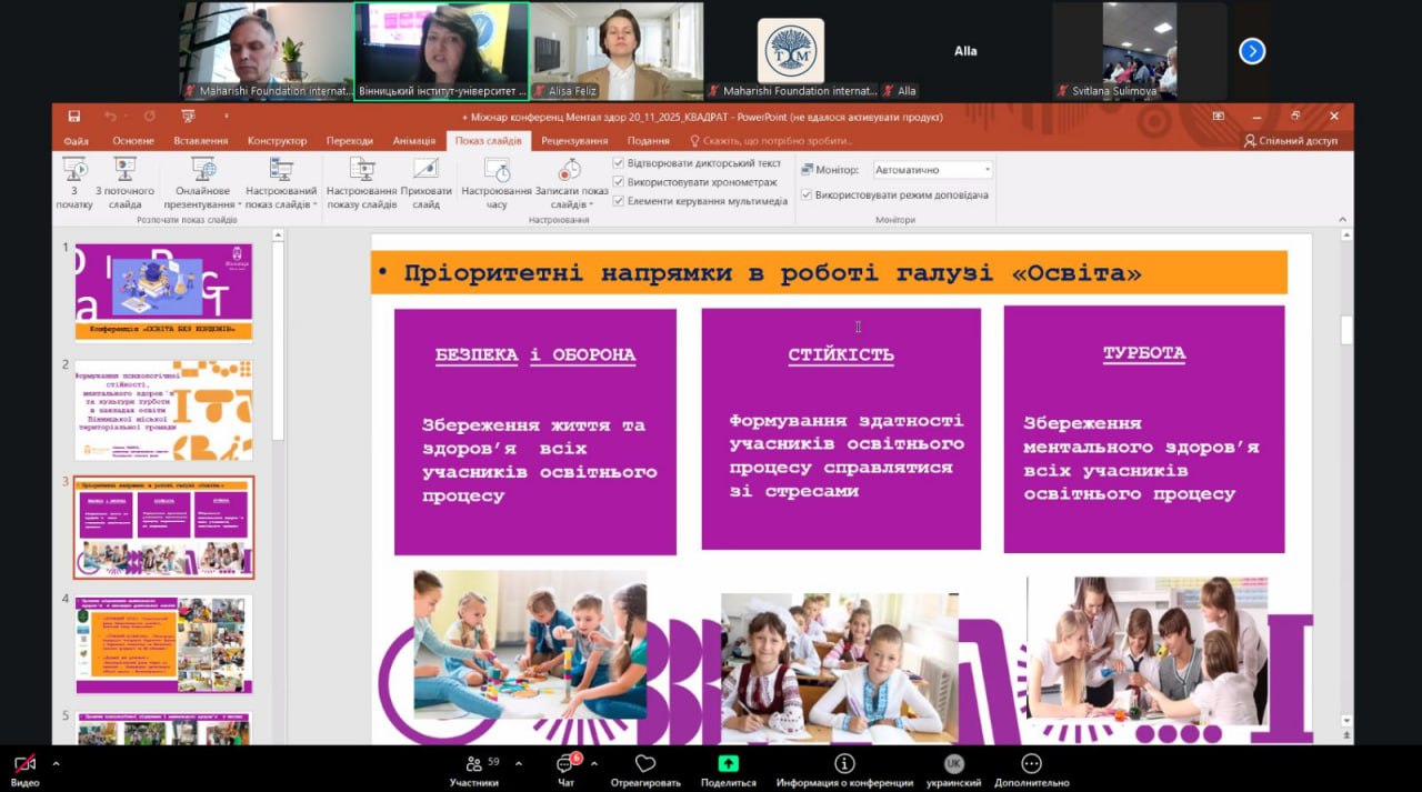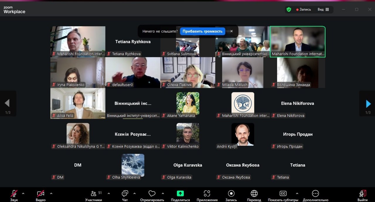 Робота заходу була зосереджена навколо таких важливих напрямів, як глобальні тенденції та інноваційні моделі навчання, питання психологічної стійкості, ментального здоров’я та культури турботи, дослідження трансцендентальної медитації та практик усвідомленості, обговорення освітніх технологій майбутнього та цифрової трансформації, а також вивчення психології творчості, самореалізації, розвитку потенціалу особистості та освіти як простору відновлення, миру та гармонії. Окрему увагу було приділено психологічним аспектам лідерства та командної взаємодії та інноваційним стратегіям розвитку безбар’єрної освіти.