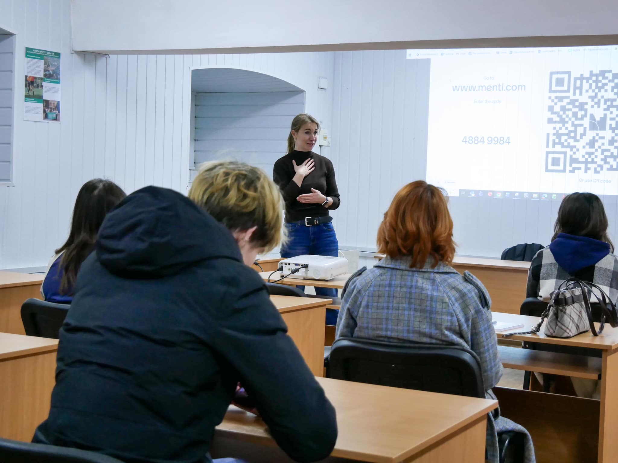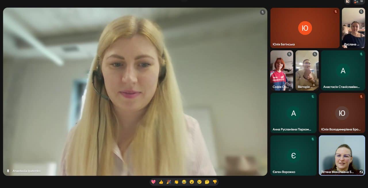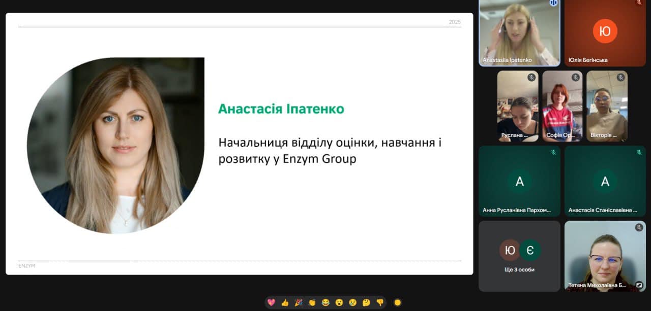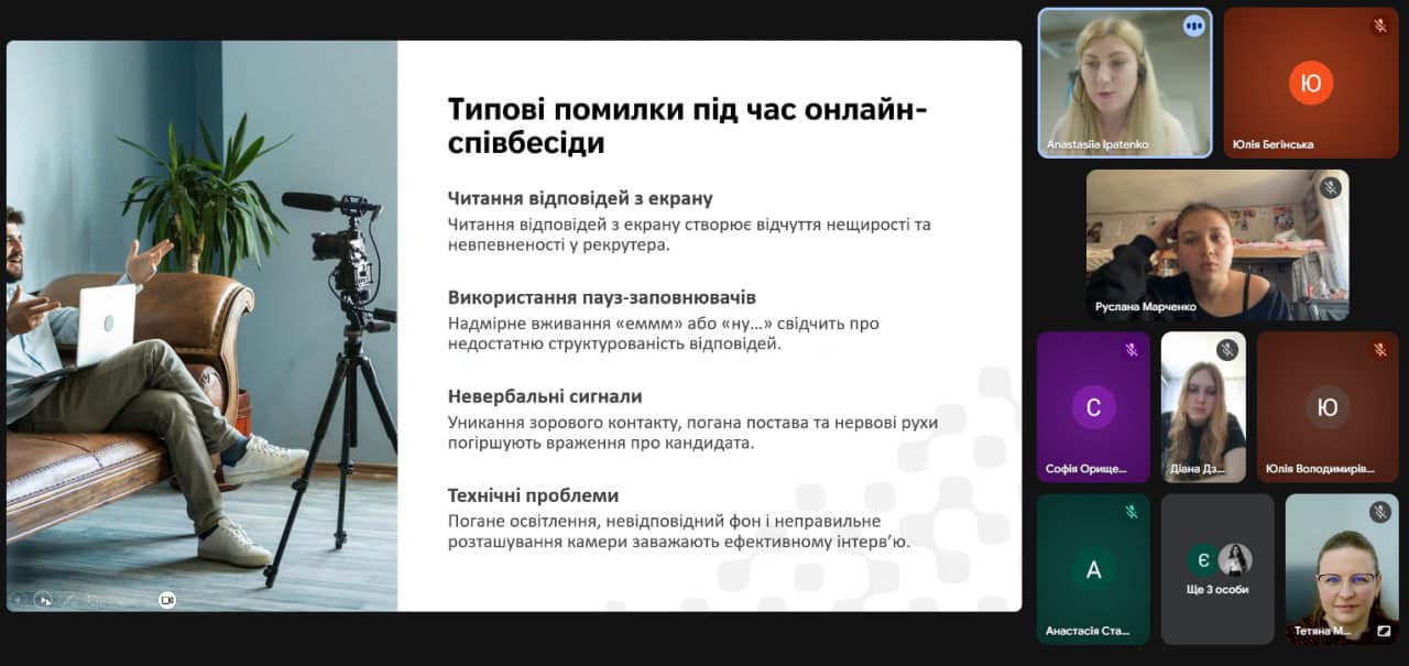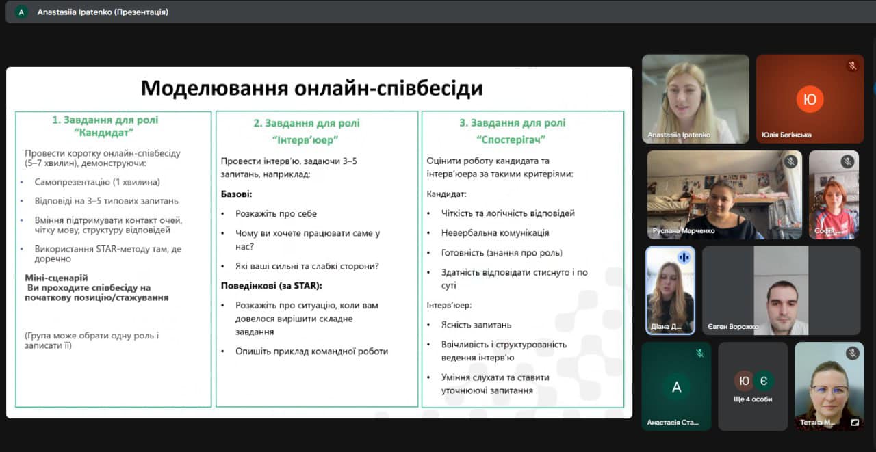 Наступним етапом стала онлайн-імітація співбесіди «Презентуємо себе» з Анастасією Іпатенко (Enzym Group, м. Львів). Студенти опанували методи ефективної самопрезентації, навчилися вигідно підкреслювати власні навички та зрозуміли важливість проактивної позиції кандидата. Особливістю зустрічі стала практична частина, де учасники в ігровій формі випробували себе в ролях рекрутера, кандидата та спостерігача, відпрацьовуючи відповіді на складні запитання та алгоритми взаємодії з роботодавцем.