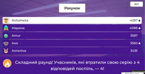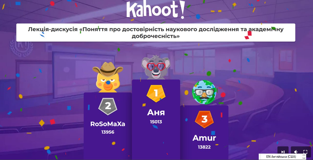 З урахуванням попередньої обізнаності здобувачів вищої освіти з питань академічної доброчесності спікерка застосувала метод «перевернутого класу», що дозволив активізувати навчальну взаємодію та залученість студентів із перших хвилин заняття. Зокрема, на початку лекції було проведено інтерактивне опитування за допомогою платформи Kahoot, яке дало змогу актуалізувати наявні знання здобувачів, визначити рівень розуміння ключових понять і створити підґрунтя для подальшої дискусії та поглибленого аналізу проблематики академічної доброчесності.