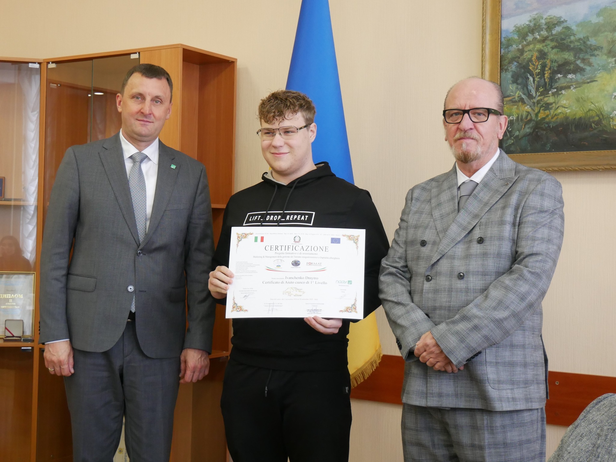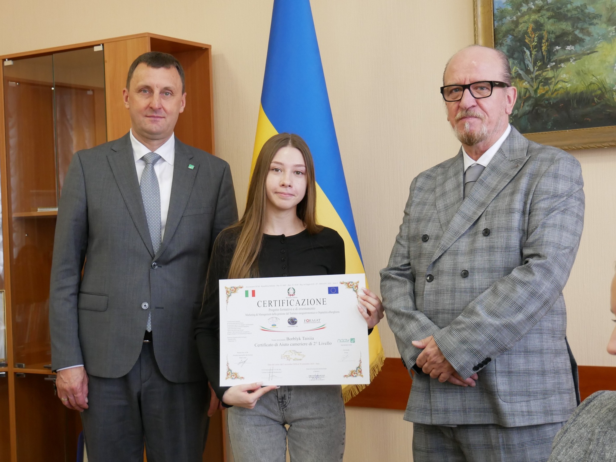 Особливо зворушливим моментом стало вручення сертифікатів студентам, які влітку проходили практику в Італії. Сертифікати 2-го рівня отримали Таїсія Борблик та Олександра Зінченко; сертифікати 1-го рівня — Дмитро Іванченко та Смага Олександр. Наші талановиті студенти гідно представили ПДАУ на міжнародному рівні.