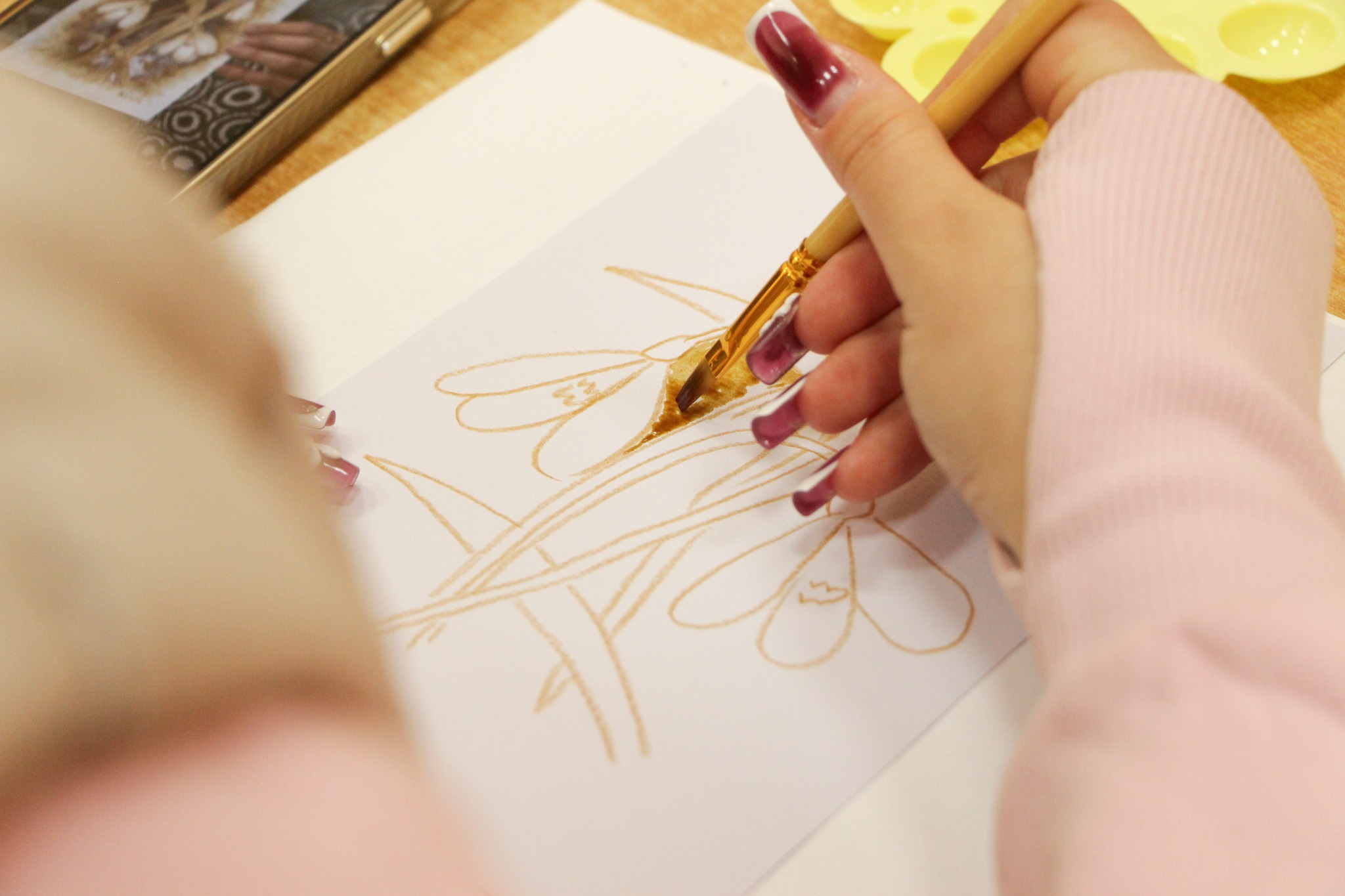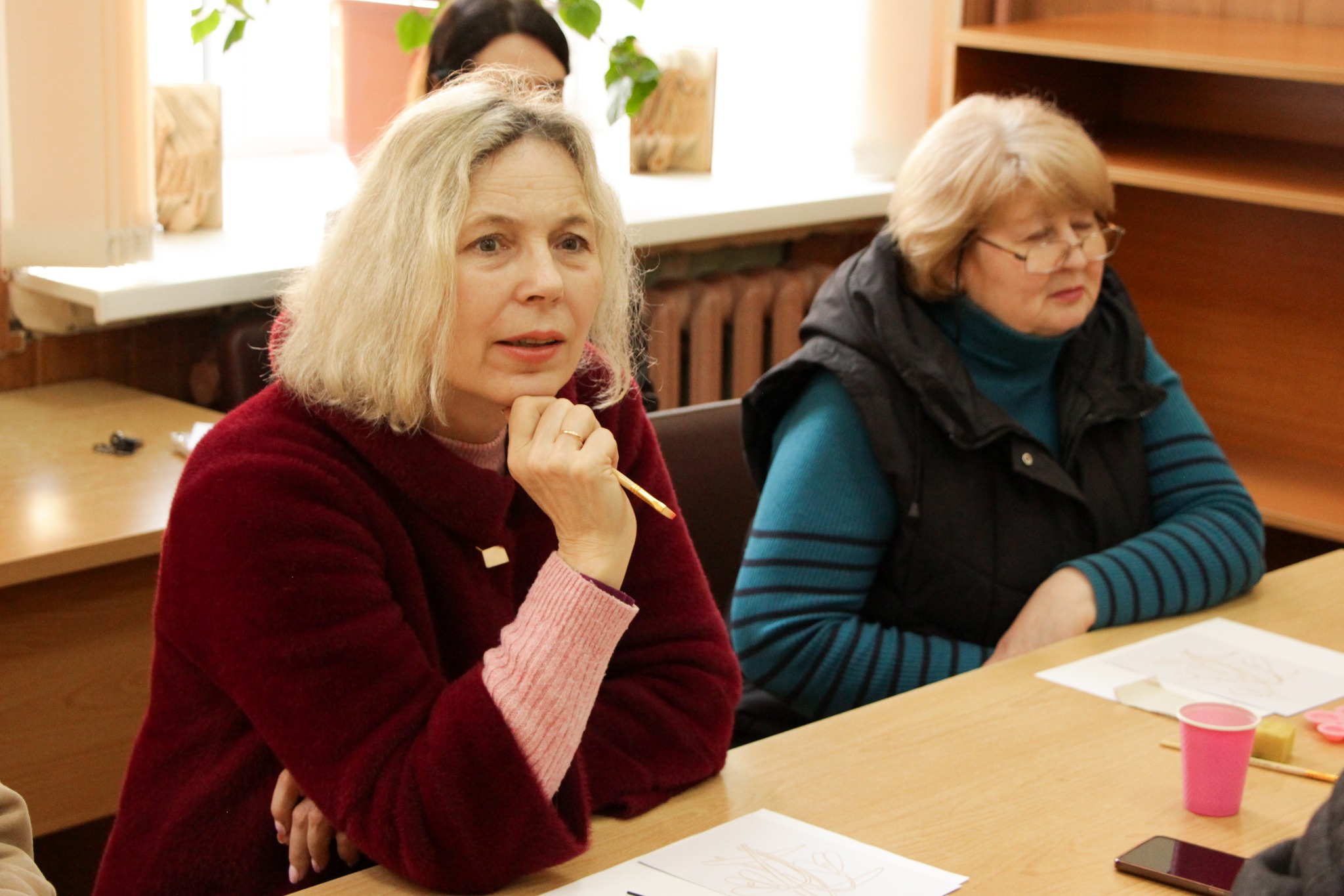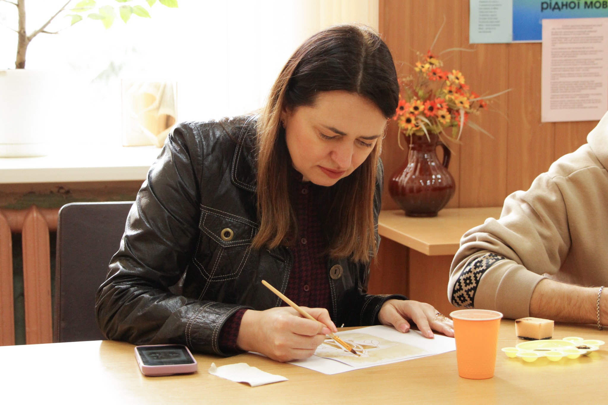 Під час зустрічі в читальній залі учасники опановували техніку створення монохромних зображень за допомогою кавового розчину. Цей метод передбачає використання різних концентрацій напою для отримання палітри відтінків: від світло-бежевих до насичених коричневих тонів. Гості заходу вчилися працювати з кавою як із художнім пігментом, регулюючи щільність нанесення шарів для створення об’єму та глибини у своїх роботах.