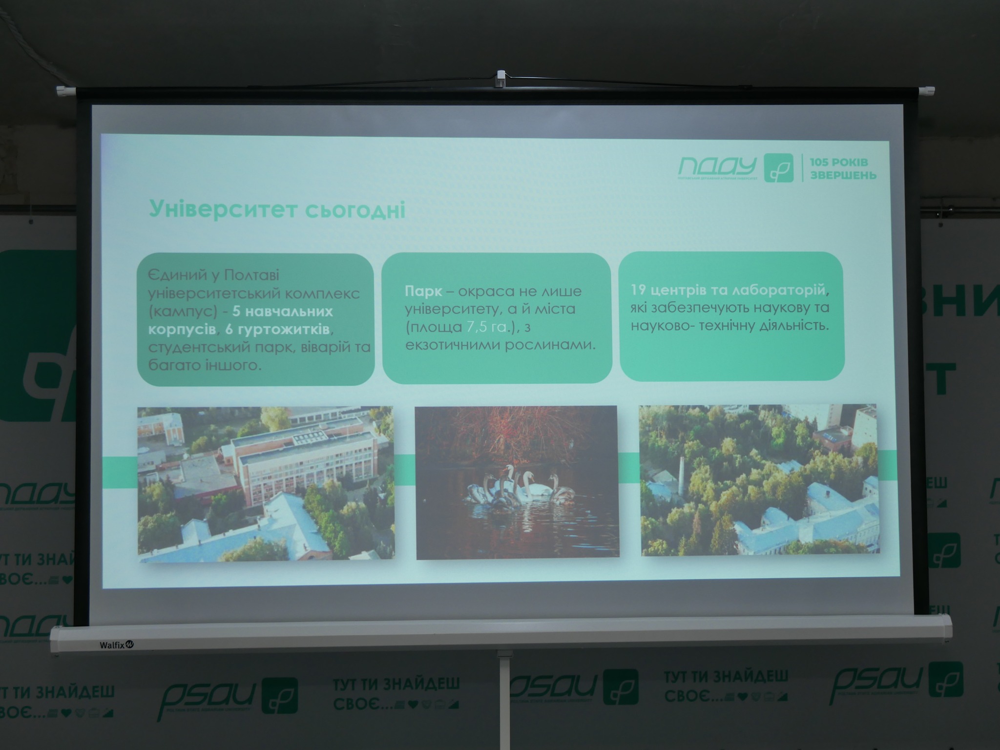 Під час зустрічі школярі побували на різноманітних локаціях двох навчально-наукових інститутів і чотирьох факультетів ПДАУ, де ознайомилися з лабораторіями, освітніми просторами, музейними експозиціями та ключовими напрямами підготовки майбутніх фахівців. Учні дізналися про можливості університету, специфіку спеціальностей і побачили, як організований навчальний процес у сучасному аграрному закладі вищої освіти.
