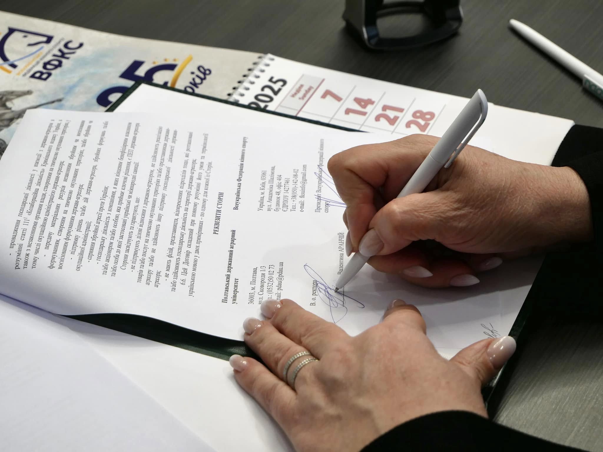 4 березня у Полтавському державному аграрному університеті відбулася знакова подія — підписання договору про співробітництво між університетом і Всеукраїнською федерацією кінного спорту України. Документ скріпили підписами в.о. ректора, голова вченої ради ПДАУ Валентина Аранчій і президент Федерації Андрій Мілованов.