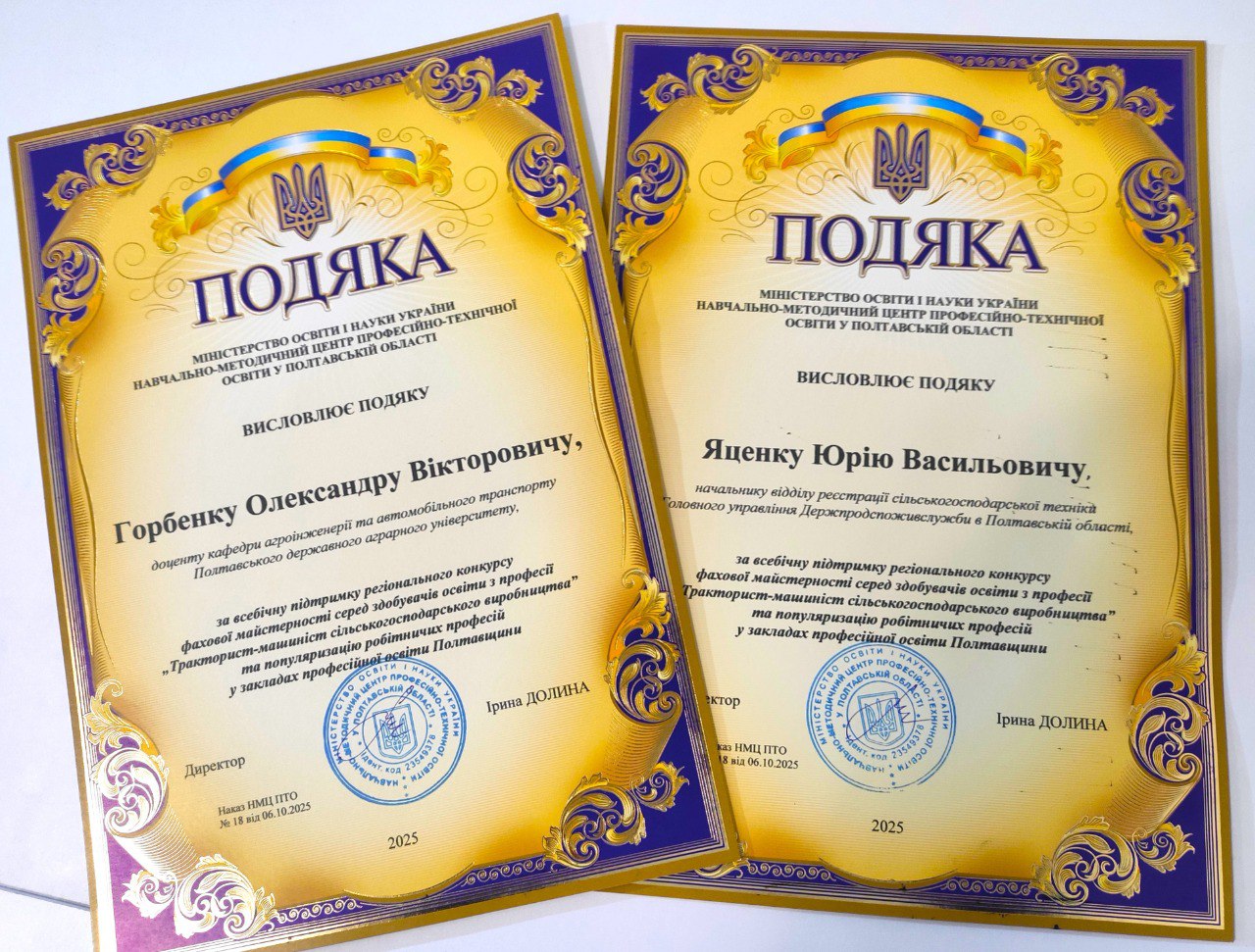 8 жовтня викладачі кафедри агроінженерії та автомобільного транспорту Полтавського державного аграрного університету Яценко Юрій і Горбенко Олександр у складі журі долучилися до проведення регіонального конкурсу фахової майстерності з фаху «Тракторист-машиніст сільськогосподарського виробництва» серед здобувачів освіти закладів професійної освіти Полтавської області.