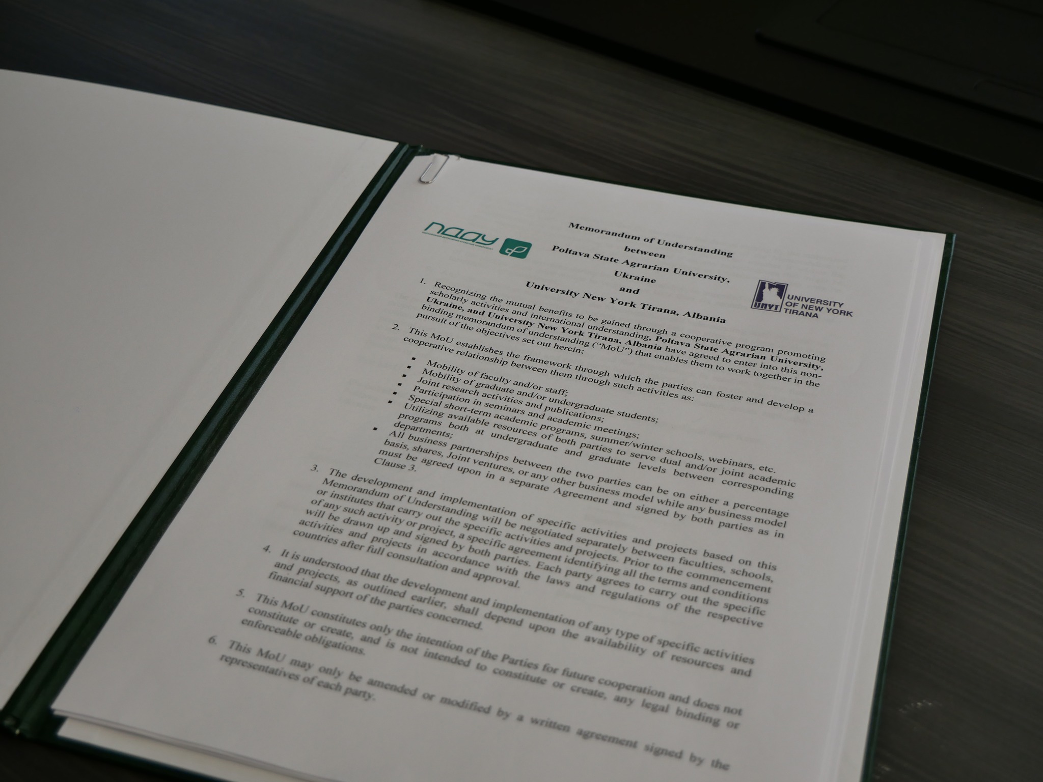 22 вересня 2025 року ректор Полтавського державного аграрного університету Олександр Галич підписав Меморандум про взаєморозуміння з University New York Tirana – провідним університетом Албанії, що активно розвиває англомовні освітні програми та міжнародні академічні проєкти.