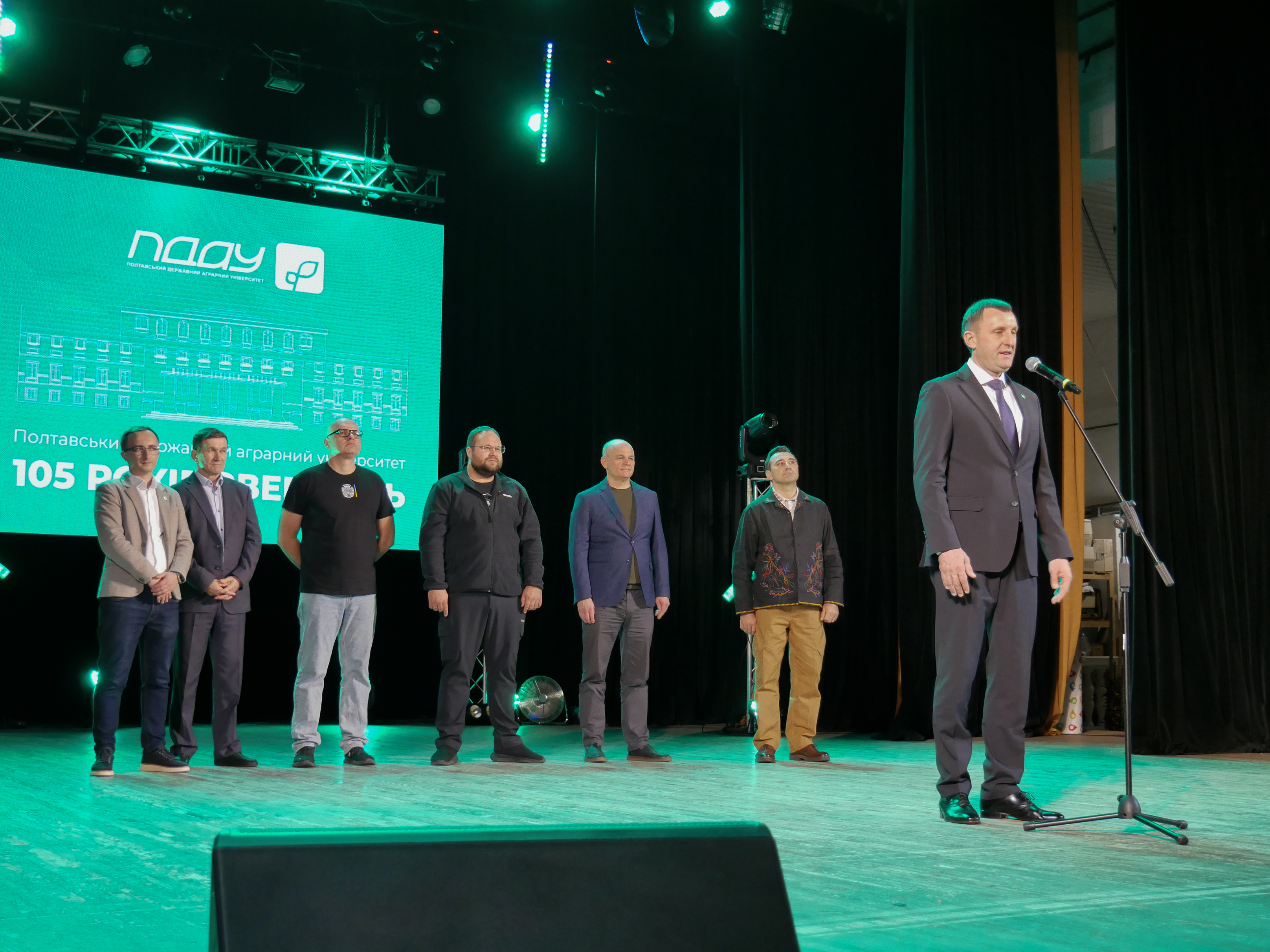 Урочистості розпочалися з вітального слова ректора ПДАУ професора Олександра Галича, який наголосив, що 105-річна історія університету — це, передусім, історія людей, які творили й продовжують творити його щодня: ректорів, деканів, завідувачів кафедр, професорів, доцентів, співробітників, студентів та всіх, хто причетний до життя закладу. Він підкреслив, що студентські роки — це найкращий час для формування життєвої мудрості, становлення особистості, пошуку справжніх дружніх зв’язків та кохання. Ректор висловив глибоку вдячність захисникам і захисницям України, завдяки яким університет продовжує виконувати свою місію, докладаючи максимум зусиль до навчання молоді та розбудови держави. Професор Галич акцентував увагу на інноваційності ПДАУ та високо оцінив роль партнерів, які сприяють розвитку матеріально-технічної бази та організації стажувань. Він зазначив, що потужна команда університету налічує близько 6000 студентів і 700 співробітників, а також подякував обласній військовій адміністрації та міській раді за підтримку, підкресливши активну участь ПДАУ в житті територіальної громади. З вітальними словами до присутніх звернулися й почесні гості, серед яких: Олександр Лемешко — перший заступник голови Полтавської обласної ради, Віталій Нікіпелов — заступник міського голови, Дмитро Задворкін — перший заступник начальника районної військової адміністрації, Євген Кончаковський — директор Департаменту освіти і науки Полтавської ОВА, Сергій Фролов — директор Департаменту агропромислового розвитку Полтавської ОДА, голова наглядової ради, випускник університету, та Владислав Носенко — представник Уповноваженого Верховної Ради України з прав людини у Полтавській області. Вони привітали колектив університету зі знаменною датою, подякували за багаторічну плідну діяльність і підкреслили вагомий внесок ПДАУ у розвиток освіти, наукового потенціалу та аграрного комплексу регіону й держави.