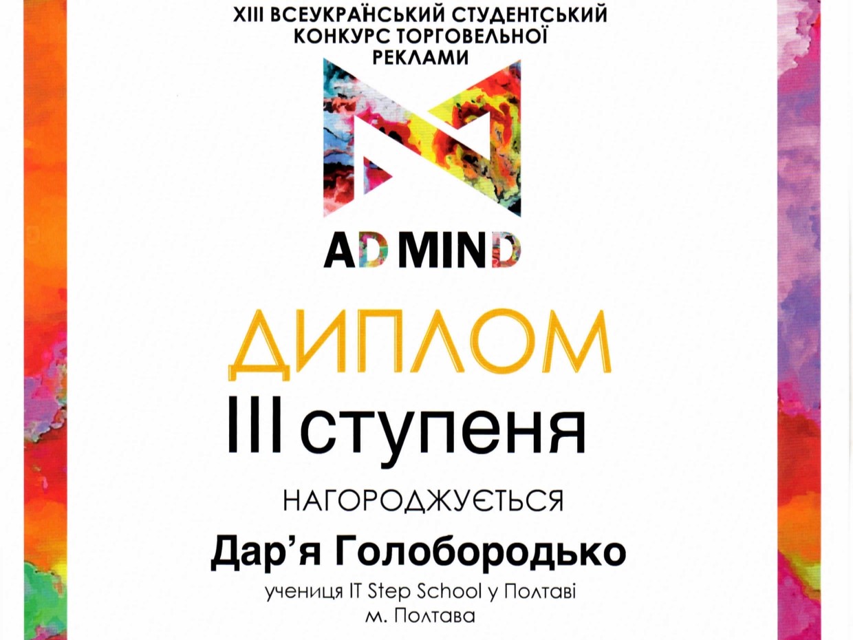 Учениця IT STEP SCHOOL у Полтаві Дар'я Голобородько під керівництвом старшого викладача кафедри маркетингу ПДАУ Ігоря Лядського виборола третє місце на XIII Всеукраїнському студентському конкурсі торговельної реклами в номінації "Реклама, створена юніорами".