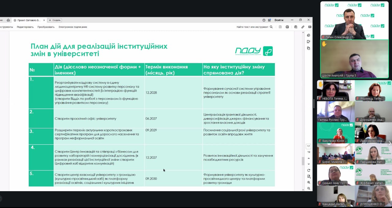 Отже, запропонований інституційний проєкт змін орієнтований на системну трансформацію Полтавського державного аграрного університету шляхом розвитку людського капіталу, інноваційної діяльності, інтеграції з бізнесом і громадою.