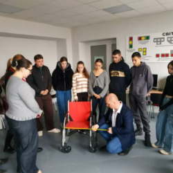 Практична частина заходу складалася з елементів інженерного аналізу доступності середовища. Студенти мали змогу ознайомитися з конструктивними особливостями колісного крісла як одного з основних засобів мобільності для людей з порушеннями опорно-рухового апарату. На занятті вони проаналізували його ключові лінійні параметри, зокрема ширину, радіус маневрування та інші технічні характеристики, що безпосередньо впливають на вимоги до проєктування доступного простору.