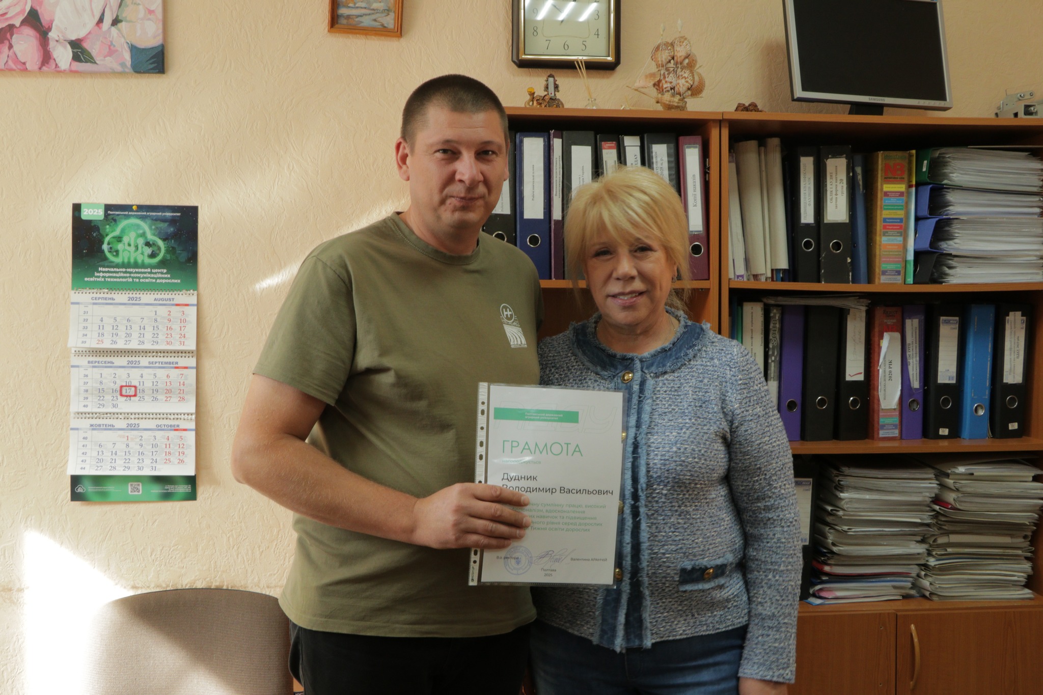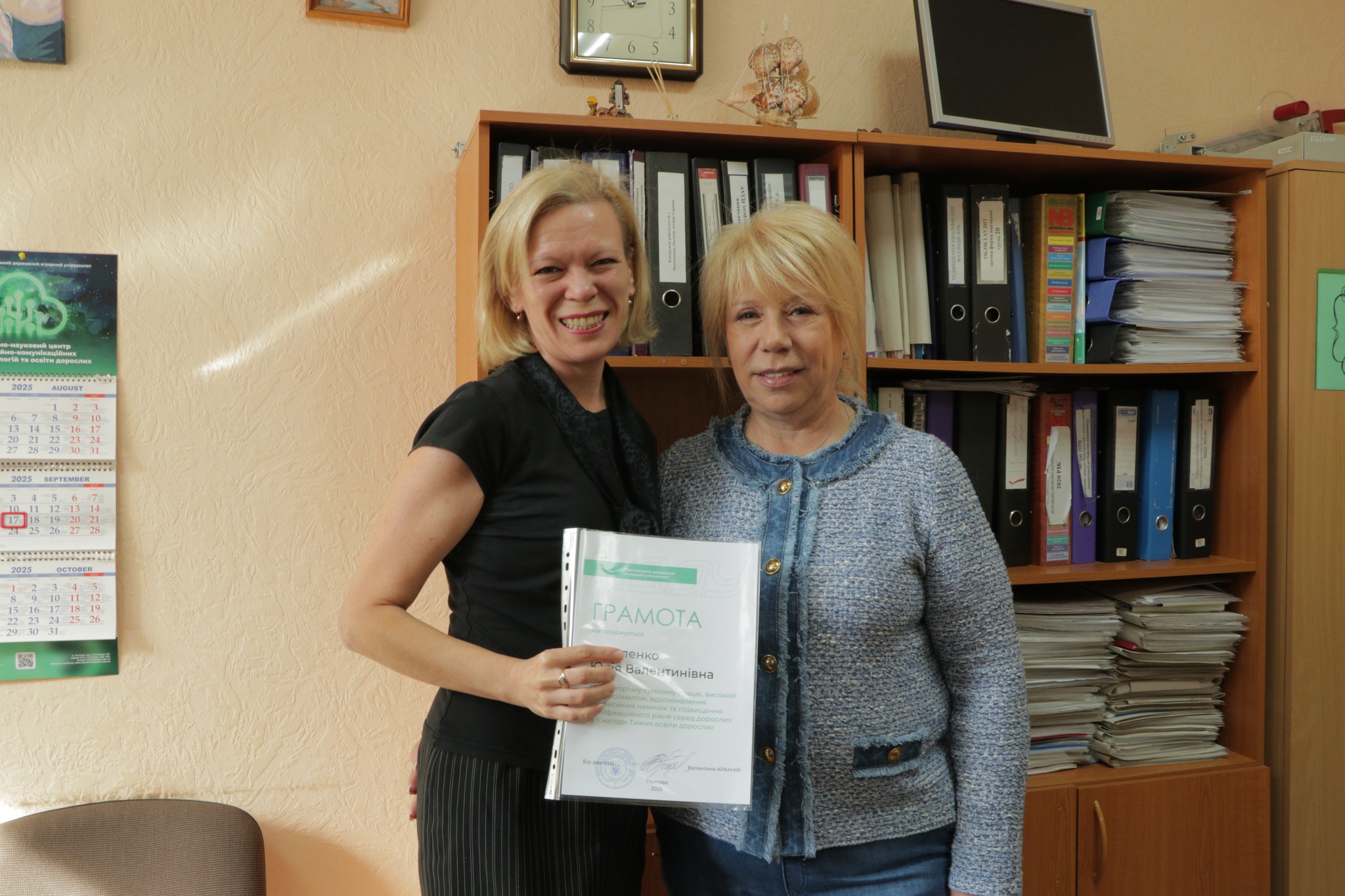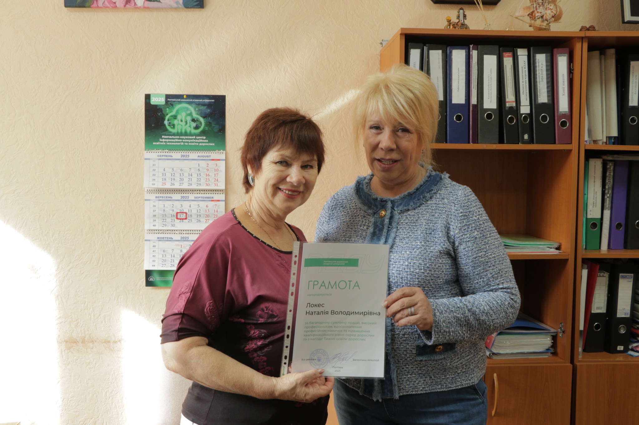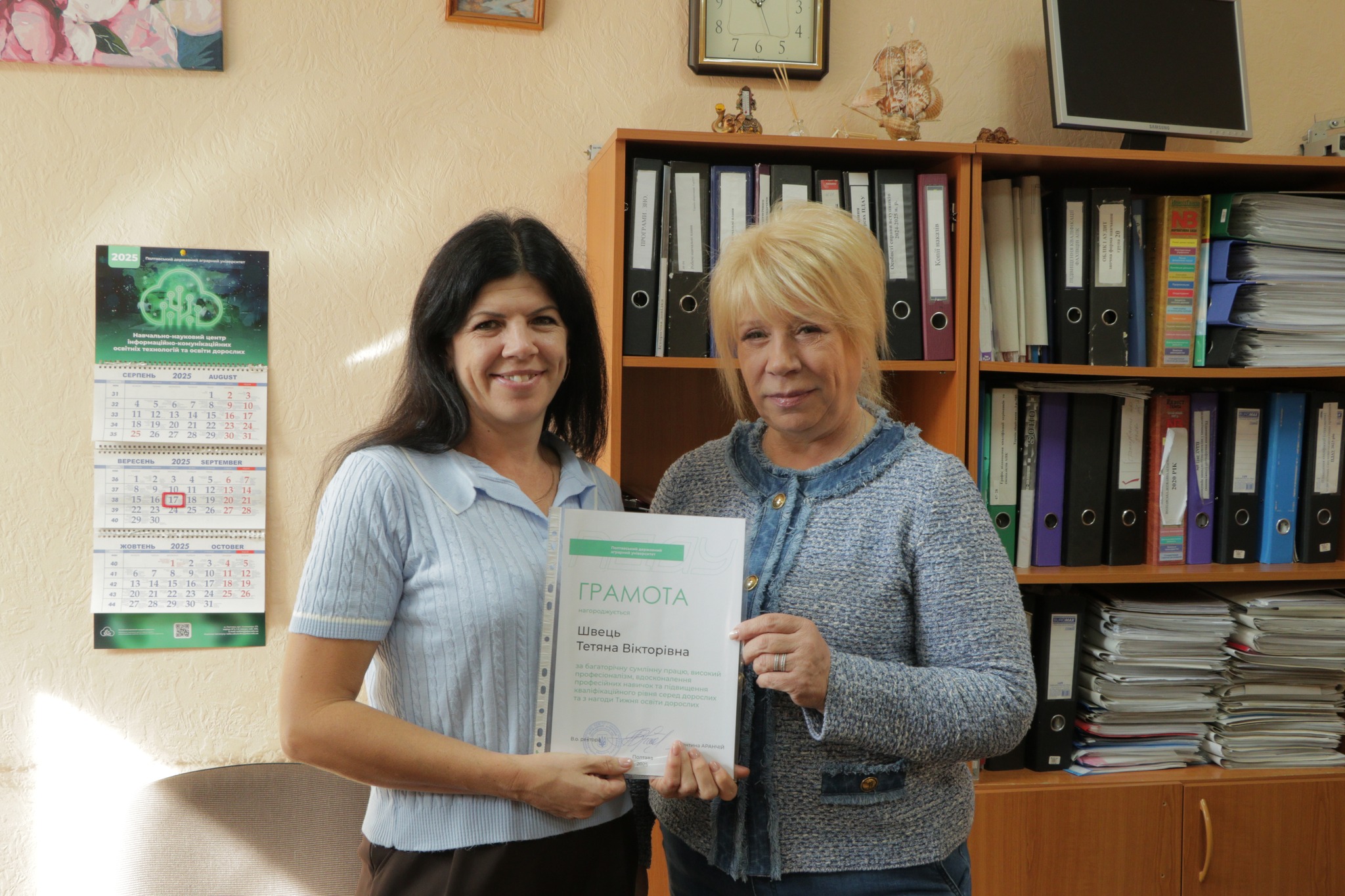 17 вересня з нагоди Дня HR-менеджера та Тижня освіти дорослих голова вченої ради ПДАУ Валентина Аранчій і голова профспілки Юлія Радочина привітали колективи кафедри менеджменту ім. І. А. Маркіної та Навчально-наукового центру інформаційно-комунікаційних освітніх технологій та освіти дорослих.