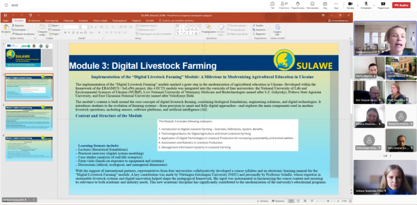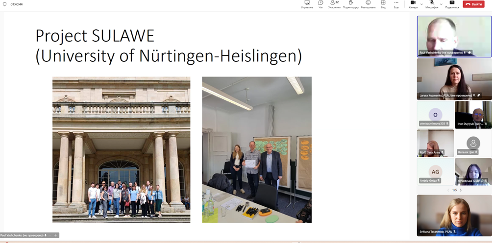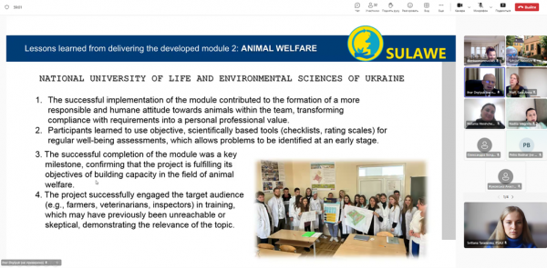 Про реалізацію програми внутрішньої академічної мобільності доповіла здобувачка вищої освіти факультету технологій тваринництва та продовольства другого (магістерського) рівня Світлана Тараненко. Студентка поділилася досвідом навчання в Національному університеті біоресурсів і природокористування України, де вона навчалася та опановувала освітні компоненти, що відповідають трьом модулям проєкту SuLaWe: «Стале тваринництво», «Благополуччя тварин» і «Цифрове тваринництво». Результати навчання, здобуті студенткою за програмою академічної мобільності, підтверджені сертифікатом НУБіП України, були визнані у ПДАУ і перезараховані їй.