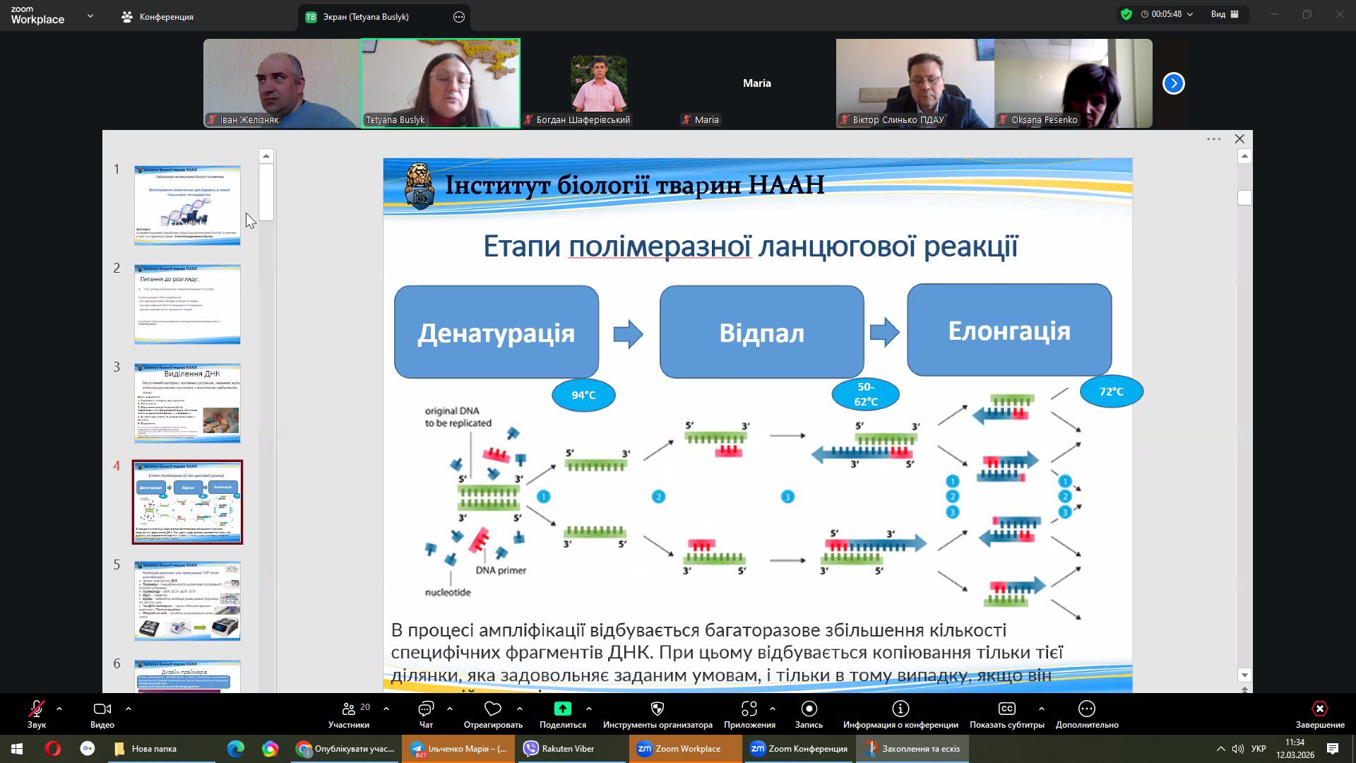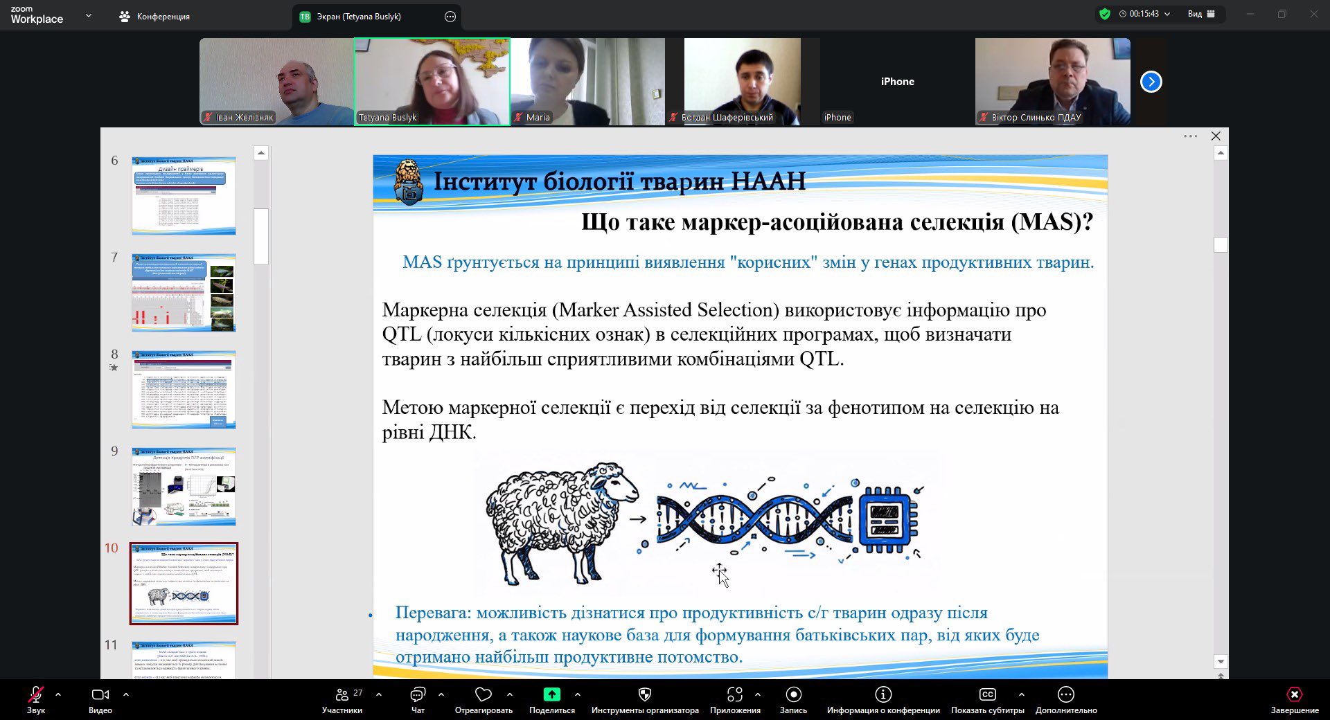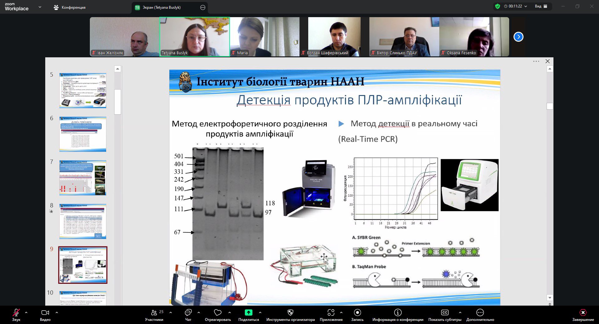 Протягом зустрічі були розглянуті питання методу полімеразно ланцюгової реакції, етапи і застосування у агробіології, сучасні тенденції дослідження геному. Окреме питання було присвячене методу маркер-асоційованої селекції (МАS) у тваринництві та європейському досвіду використання даного методу. Розглянули метод електрофоретичного розділення продуктів ампліфікації та метод детекції в реальному часі (Real-Time PCR).