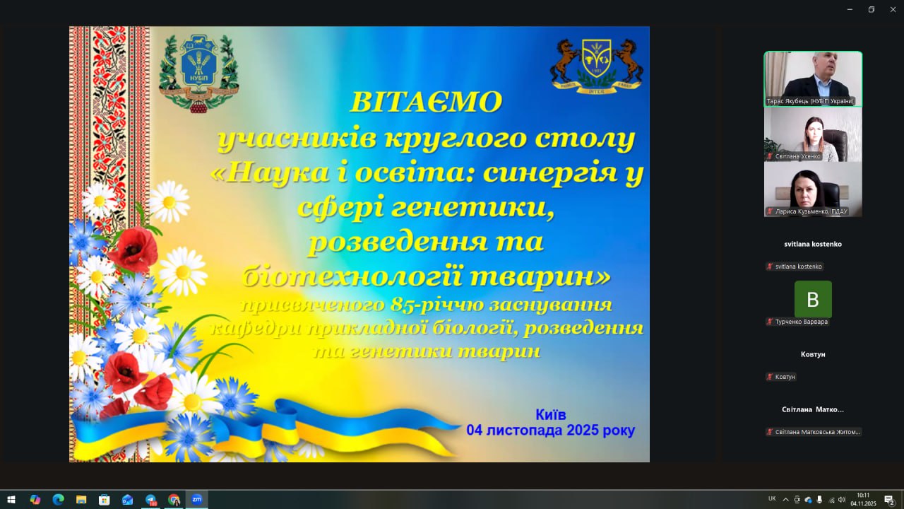 4 листопада 2025 року професори кафедри біології продуктивності тварин імені академіка О.В. Квасницького Світлана Усенко і Лариса Кузьменко взяли участь у круглому столі, присвяченому 85-річчю заснування кафедри прикладної біології, розведення та генетики тварин Національного університету біоресурсів і природокористування України за темою: «Наука і освіта: синергія у сфері генетики, розведення та біотехнології тварин».