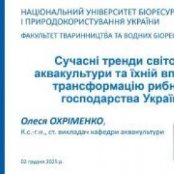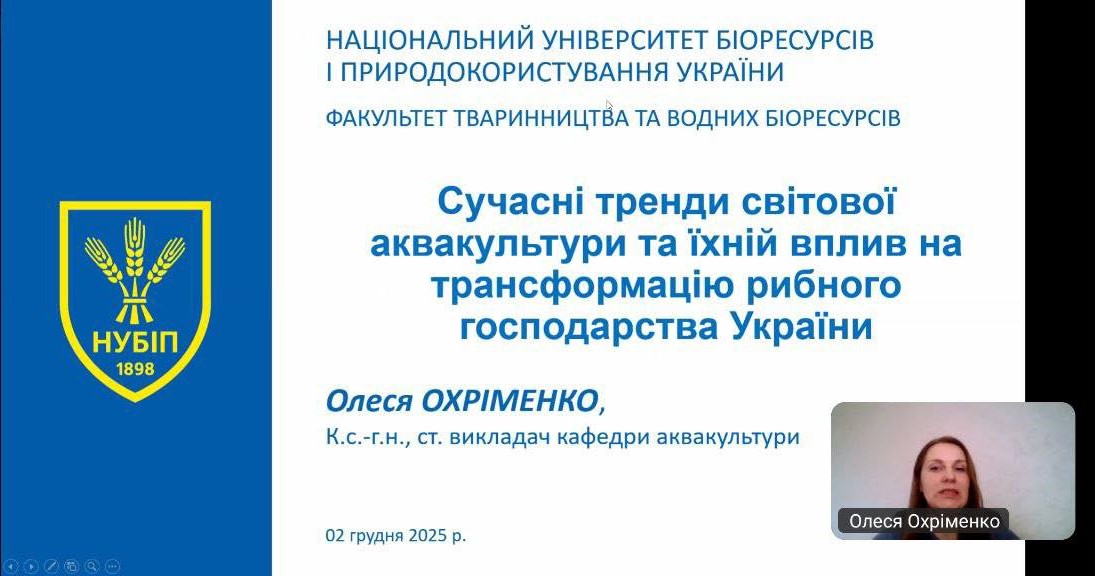 02 грудня 2025 року НПП факультету технологій тваринництва та продовольства Марія ІЛЬЧЕНКО, Богдан ШАФЕРІВСЬКИЙ, Анатолій ПОЛІЩУК взяли участь у вебінарі «Сучасні тенденції розвитку аквакультури в Україні та світі».