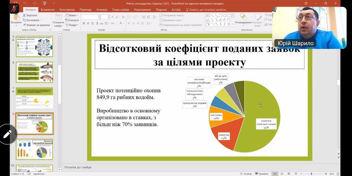 Також, цікавою була доповідь «Рибне господарство України» - доповідач Юрій ШАРИЛО - директор ДУ «Методично – технологічний центр з аквакультури». Розглянули комплекс заходів, що входять в проєкт «Навігатор аквафермерства», а також перспективні інгрідієнти, що використовуються для виробництва рибних кормів в Україні.