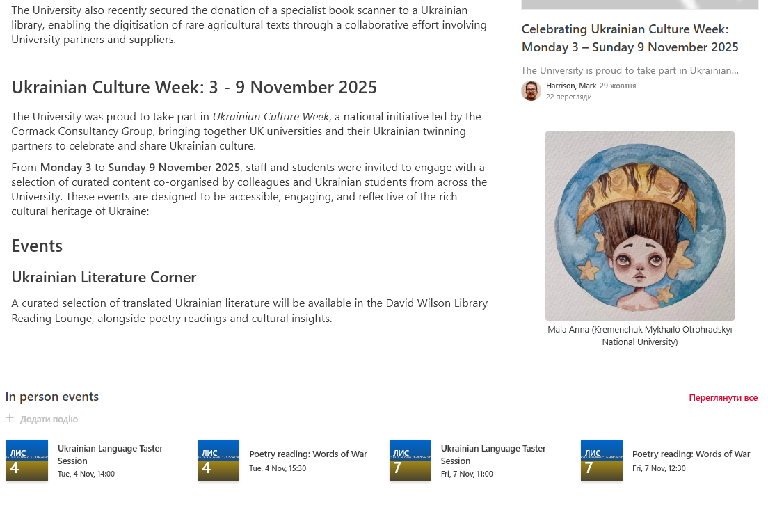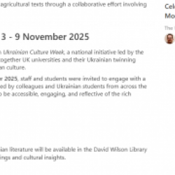 З 3 по 9 листопада 2025 року Університет Лестера з гордістю долучився до загальнонаціональної Британської ініціативи «Тиждень української культури», організованої Cormack Consultancy Group. Цей тиждень став чудовою нагодою для британських університетів і їхніх українських партнерів відсвяткувати та поділитися багатством української культури.