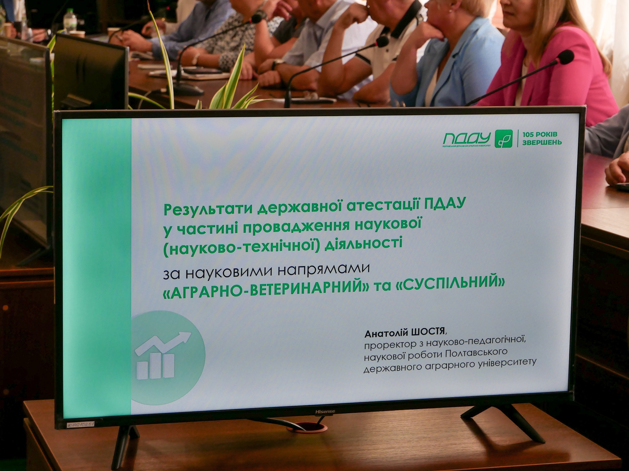 Проректор з науково-педагогічної, наукової роботи Анатолій Шостя презентував результати державної атестації Полтавського державного аграрного університету щодо провадження наукової (науково-технічної) діяльності за науковими напрямами «Аграрно-ветеринарний» і «Суспільний» за 2019–2023 роки.