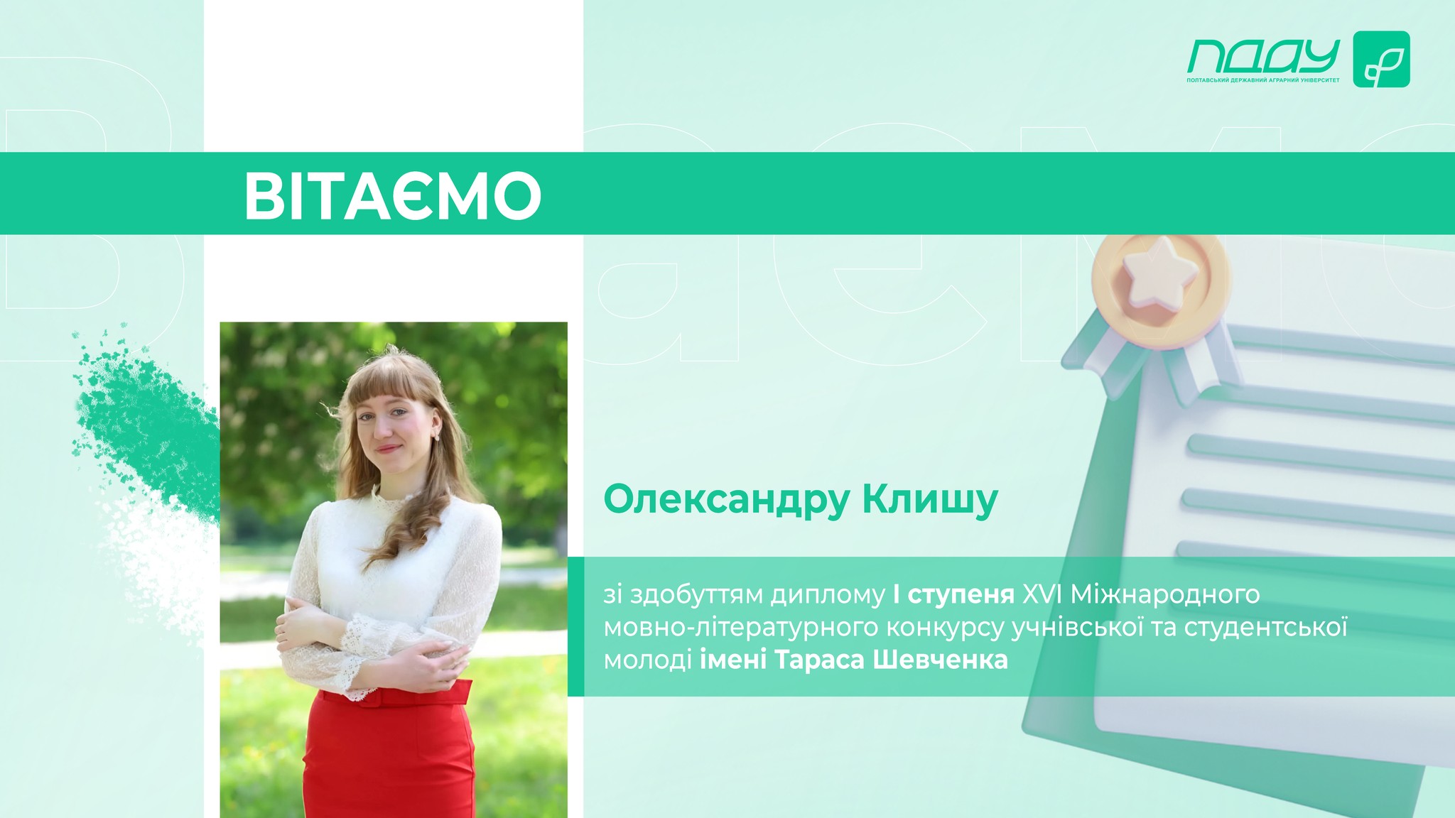 Відповідно до наказу Міністерства освіти і науки України № 651 від 17.04. 2026 (https://api.man.gov.ua/.../nakaz-mon-651-konkurs-t...) Клиша Олександра, здобувачка 4 курсу спеціальності «Облік і оподаткування» факультету обліку та фінансів ПДАУ, представлена до нагородження Диплом І ступеня XVI Міжнародного мовно-літературного конкурсу учнівської та студентської молоді імені Тараса Шевченка.