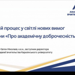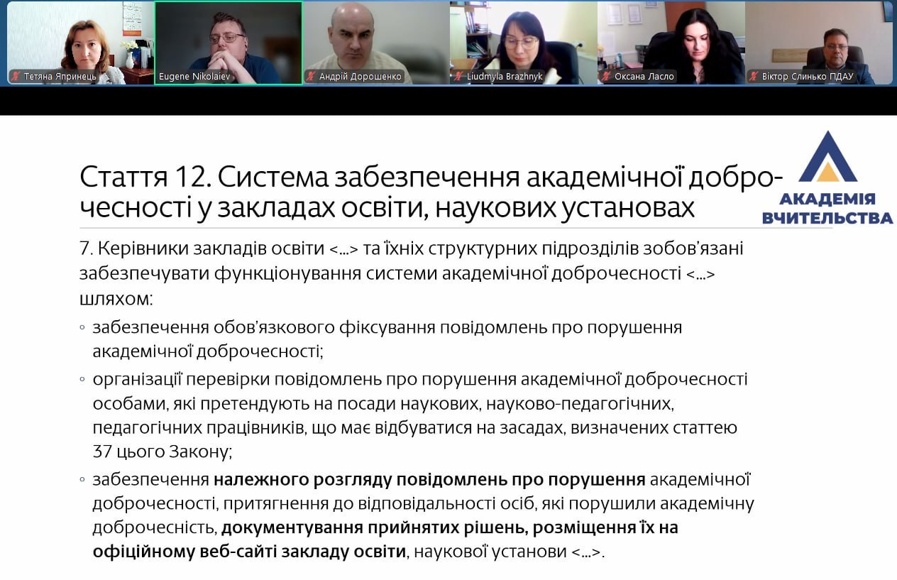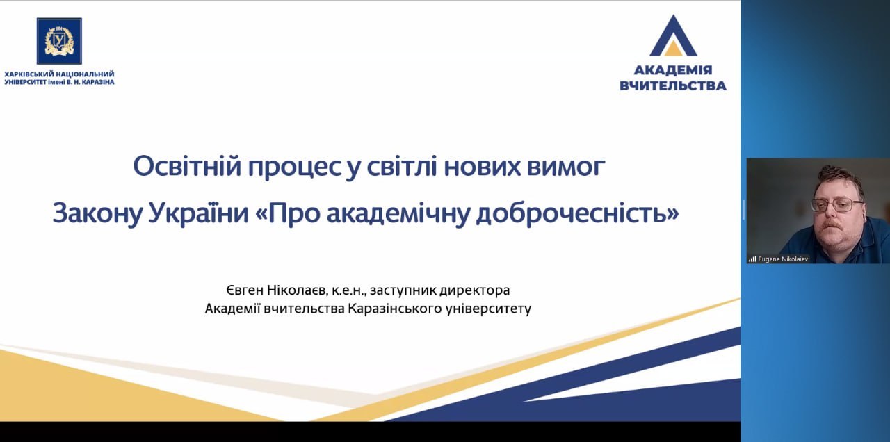 Запрошеним спікером був Євген Ніколаєв, заступник директора ННІ «Академія вчительства» Харківського національного університету імені В. Н. Каразіна, один із розробників Закону України «Про академічну доброчесність». Він представив ґрунтовний аналіз підходів до впровадження його положень у практику організації освітнього процесу. На вебінарі було розглянуто ключові аспекти: нормативно-правові засади забезпечення академічної доброчесності; особливості імплементації положень нового закону у внутрішню систему забезпечення якості освіти; практичні інструменти запобігання порушенням академічної доброчесності; роль викладача та здобувача освіти у формуванні доброчесного освітнього середовища.