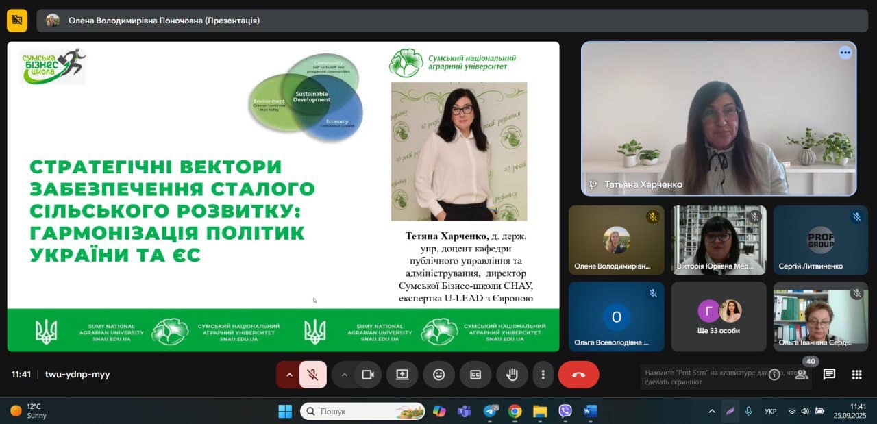 25 вересня 2025 року колектив кафедри економіки та публічного управління Полтавського державного аграрного університету організував відкриту гостьову лекцію на тему «Стратегічні вектори забезпечення сталого сільського розвитку: гармонізація політик України та ЄС». Лекцію провела Тетяна Харченко, докторка наук з державного управління, доцентка кафедри публічного управління та адміністрування, директорка Сумської бізнес-школи СНАУ, експертка програми U-LEAD з Європою.