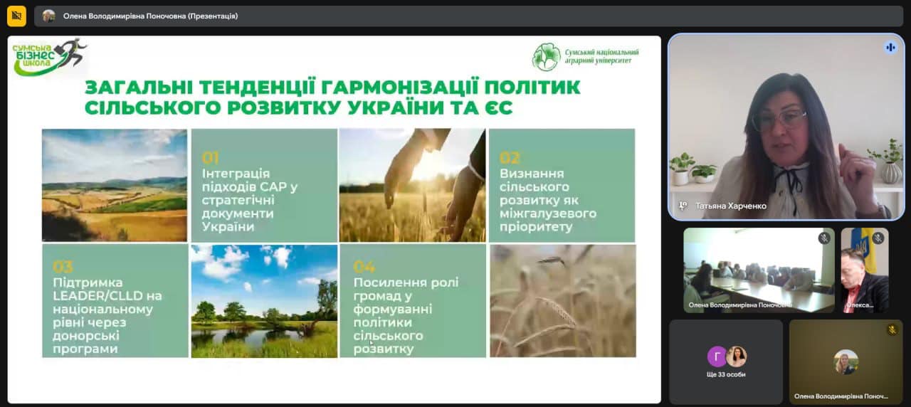 Тетяна Харченко представила ключові аспекти трансформації підходів до сільського розвитку, наголошуючи на пріоритетах Стратегії сільського господарства та сільських територій в Україні до 2030 року, правових основах сільського розвитку в законодавстві ЄС, а також інтеграції підходів Спільної аграрної політики у стратегічні документи України. Лекторка детально зупинилася на європейських ініціативах, таких як Європейський зелений курс, LEADER/CLLD та Європейський фонд гарантій сільського господарства (EAGF), а також окреслила виклики та можливості для українських громад у контексті євроінтеграції.