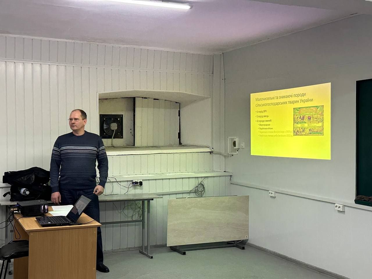Під час лекції було розглянуто актуальні питання збереження біорозмаїття сільськогосподарських тварин, зокрема локальних і малочисельних порід свиней, які є важливим елементом продовольчої безпеки, сталого розвитку аграрного сектору та збереження історико-культурної спадщини. Лектор акцентував увагу на сучасному стані генофонду тварин в Україні, навів приклади порід, що перебувають під загрозою зникнення, а також охарактеризував причини скорочення їх чисельності.