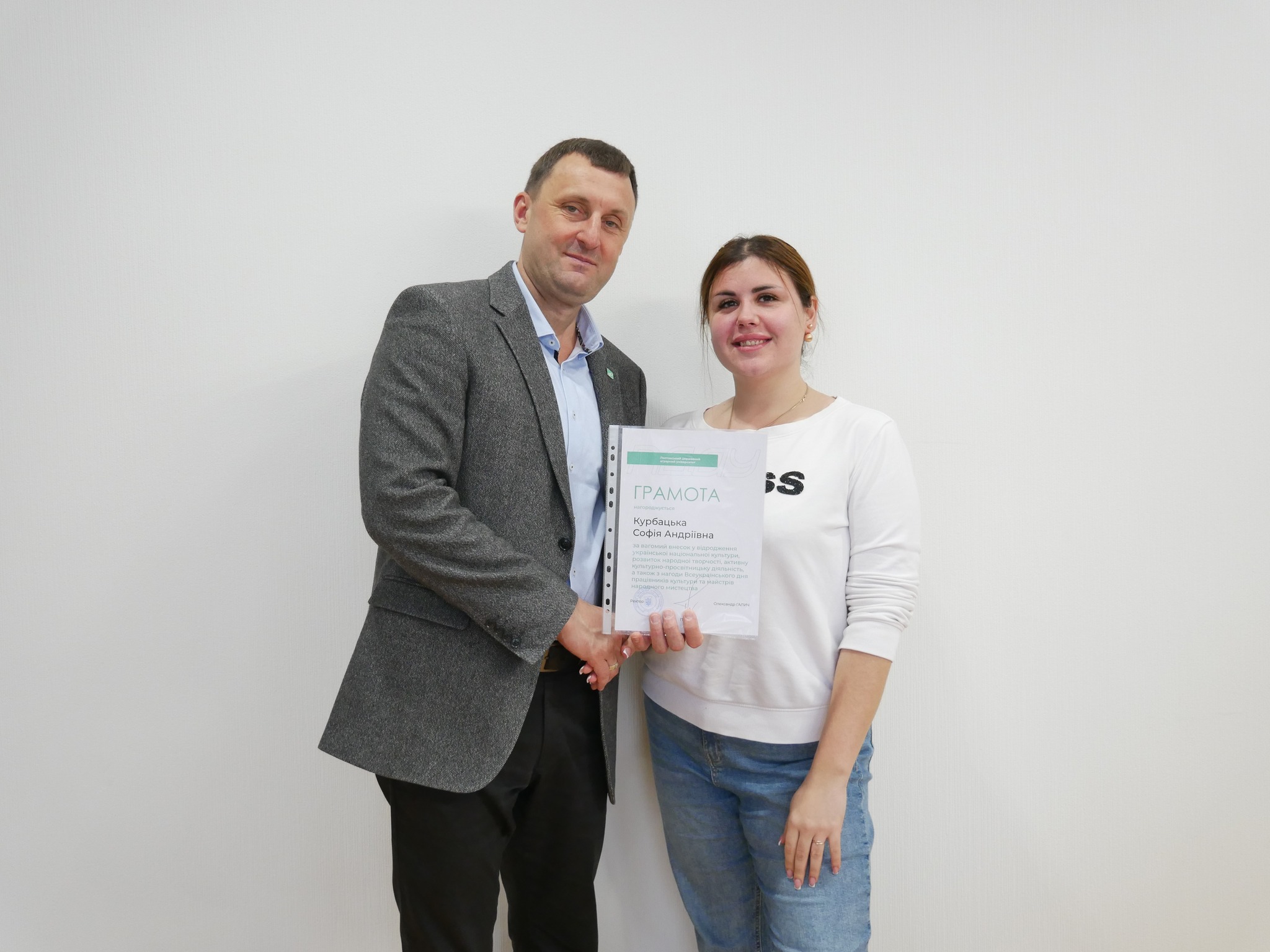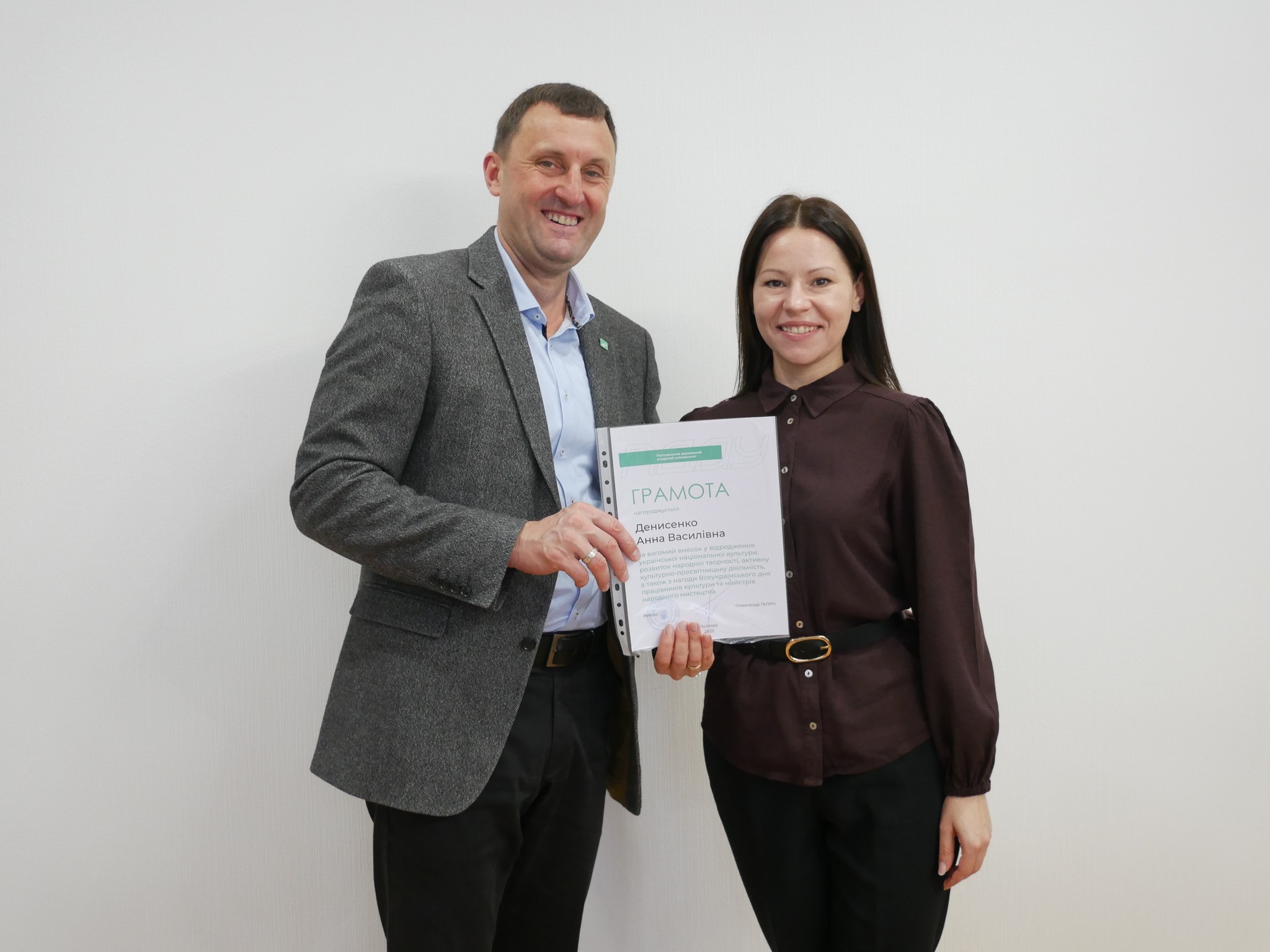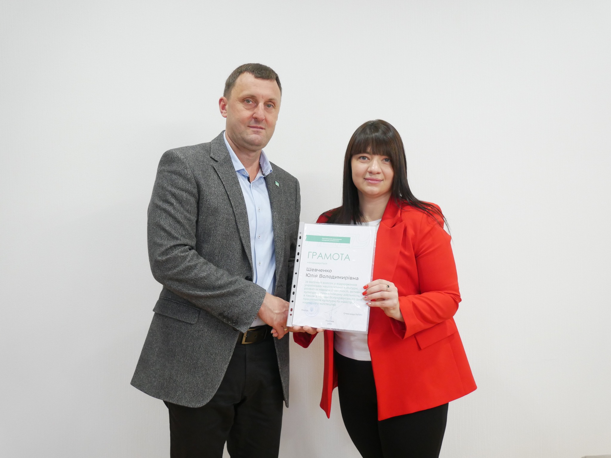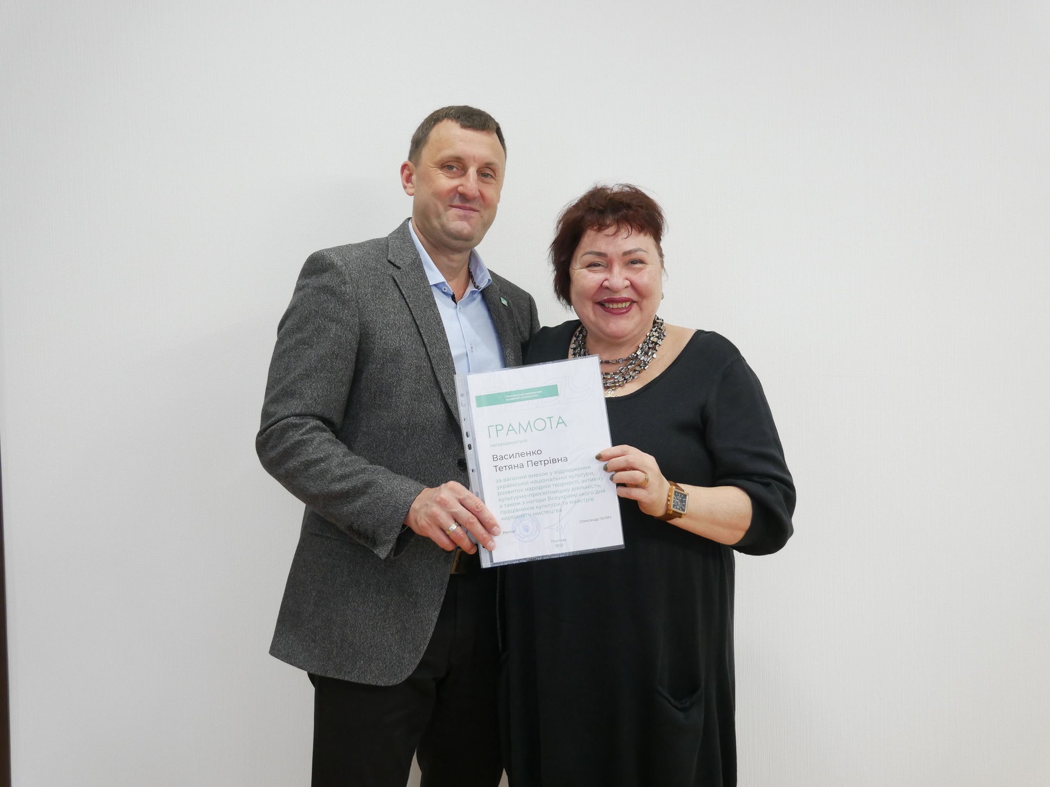 Ректор ПДАУ Олександр Галич і голова профспілки Юлія Радочіна вручили подяки працівникам підрозділу з організації виховної та іміджевої діяльності, який очолює Юлія Шевченко. Грамотами ректора за самовіддану працю, спрямовану на збереження, розвиток і відновлення духовних скарбів нашого народу, отримали працівники мистецьких колективів.