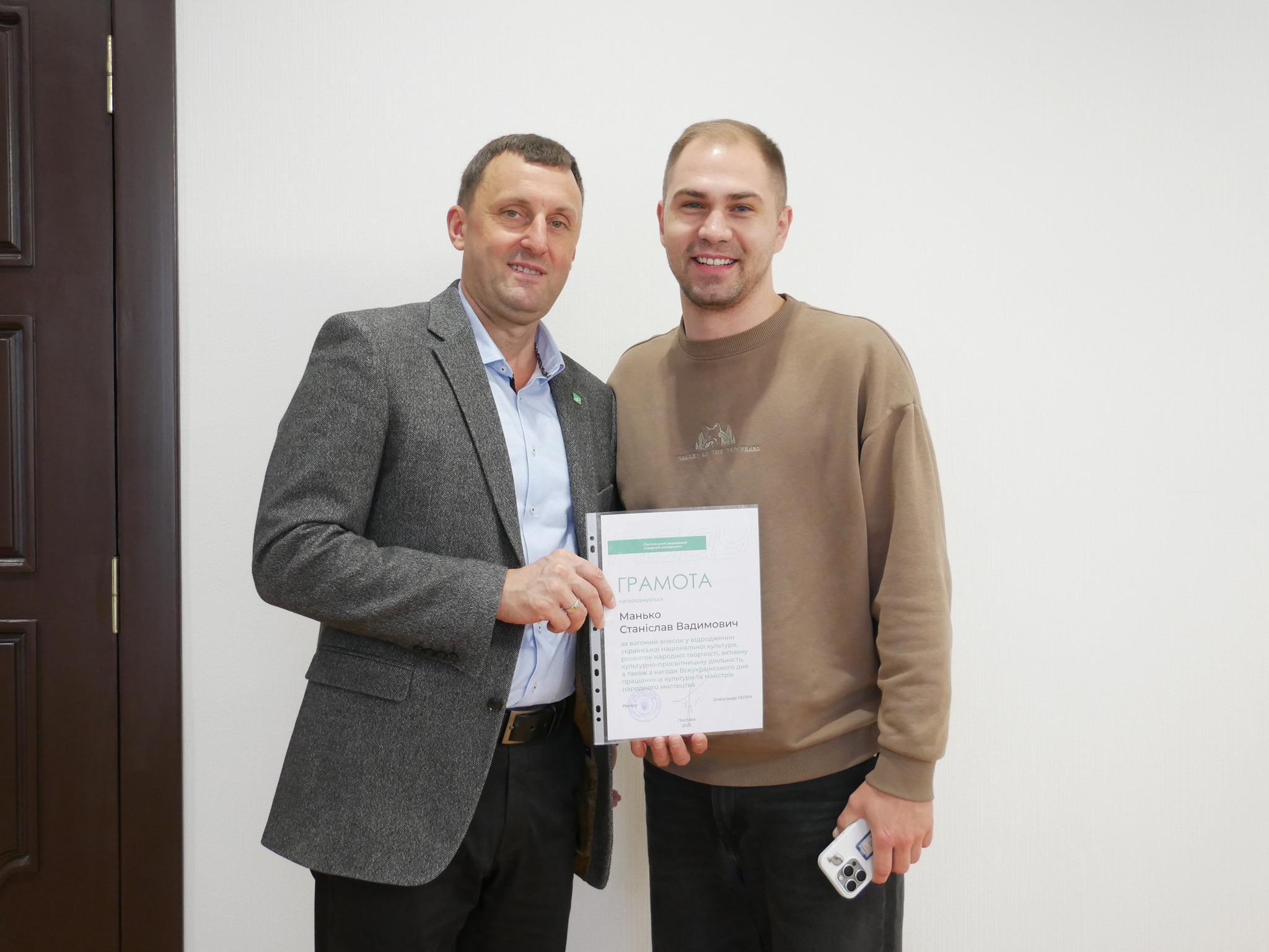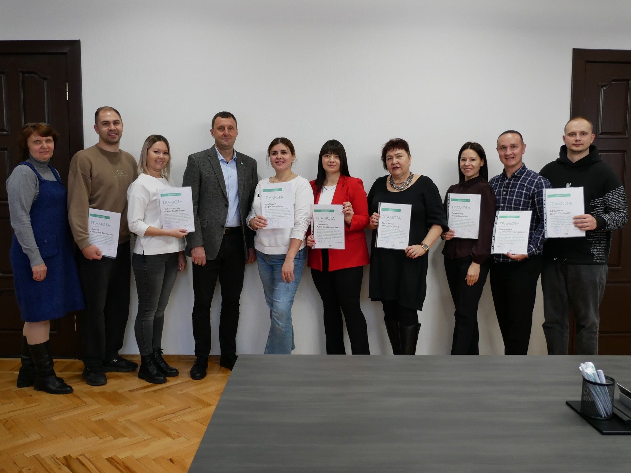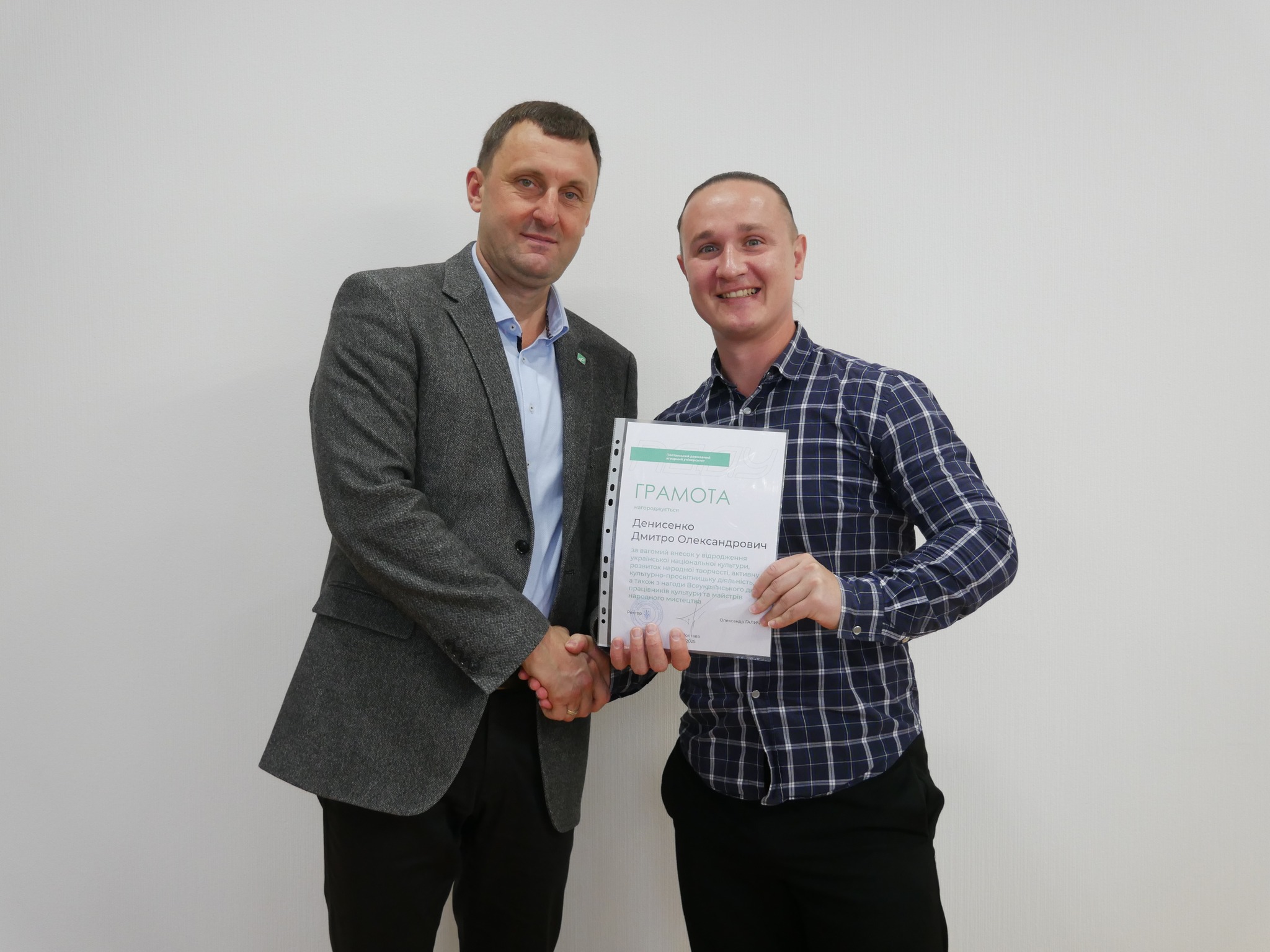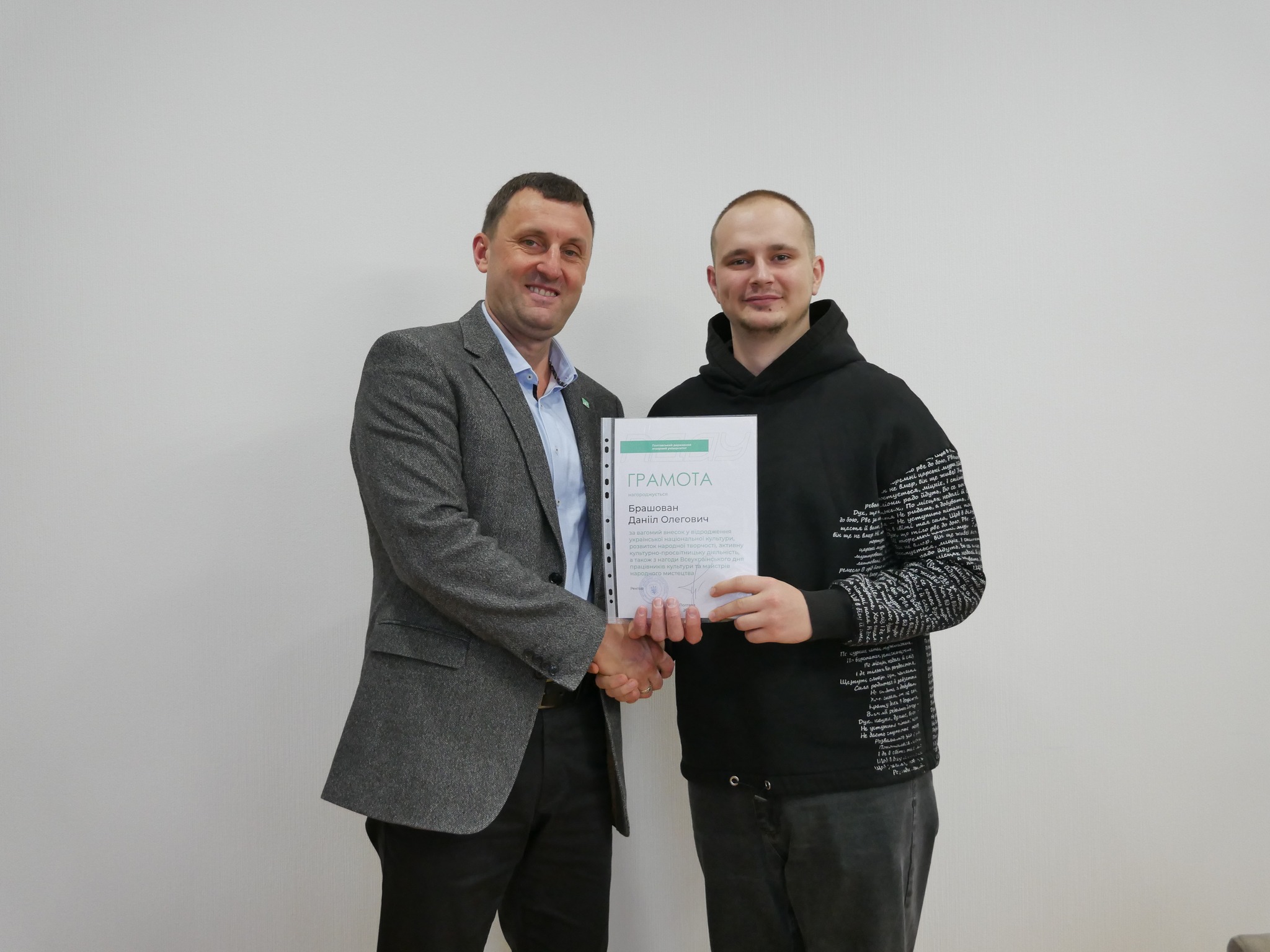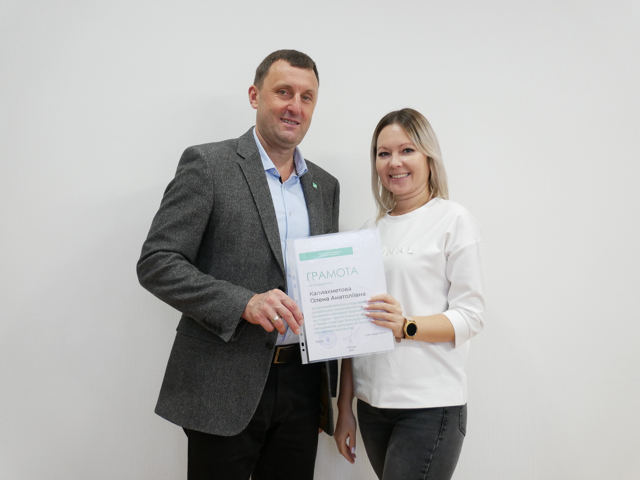 Ректор ПДАУ Олександр Галич і голова профспілки Юлія Радочіна вручили подяки працівникам підрозділу з організації виховної та іміджевої діяльності, який очолює Юлія Шевченко. Грамотами ректора за самовіддану працю, спрямовану на збереження, розвиток і відновлення духовних скарбів нашого народу, отримали працівники мистецьких колективів.