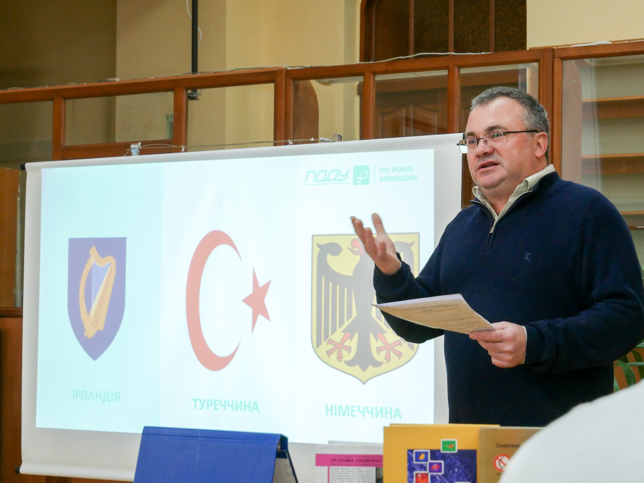 Доцент кафедри політології, історії і філософії Сергій Приходько ознайомив аудиторію з міжнародним досвідом, представивши інформацію про типи гербів, які існують у сучасних державах. Доповідач розповів про особливості геральдичних традицій різних країн і розглянув українську символіку в контексті світової геральдики.