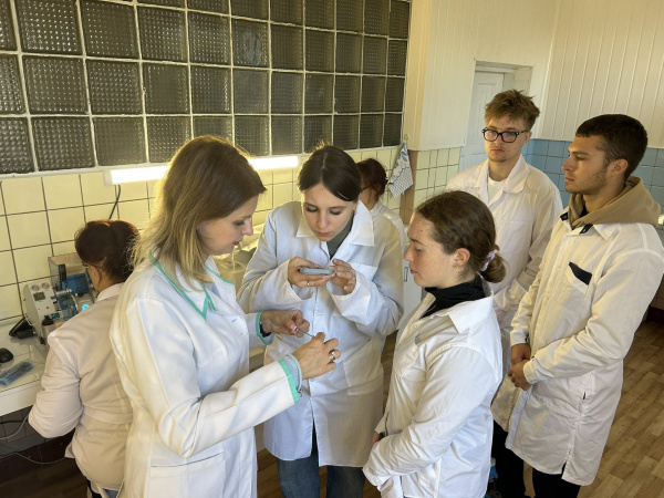 Студенти мали змогу побачити процес відбору сперми на підставного бугая за допомогою штучної вагіни. Також, ознайомилися з роботою лабораторії по дослідженню якості спермопродукції і провели оцінку якості еякулятів бугаїв – плідників, а саме: органолептичне дослідження, визначення концентрації сперміїв в еякуляті та їх активність (рухливість).