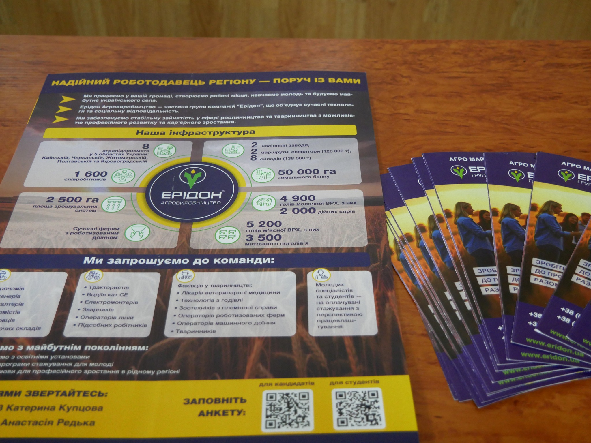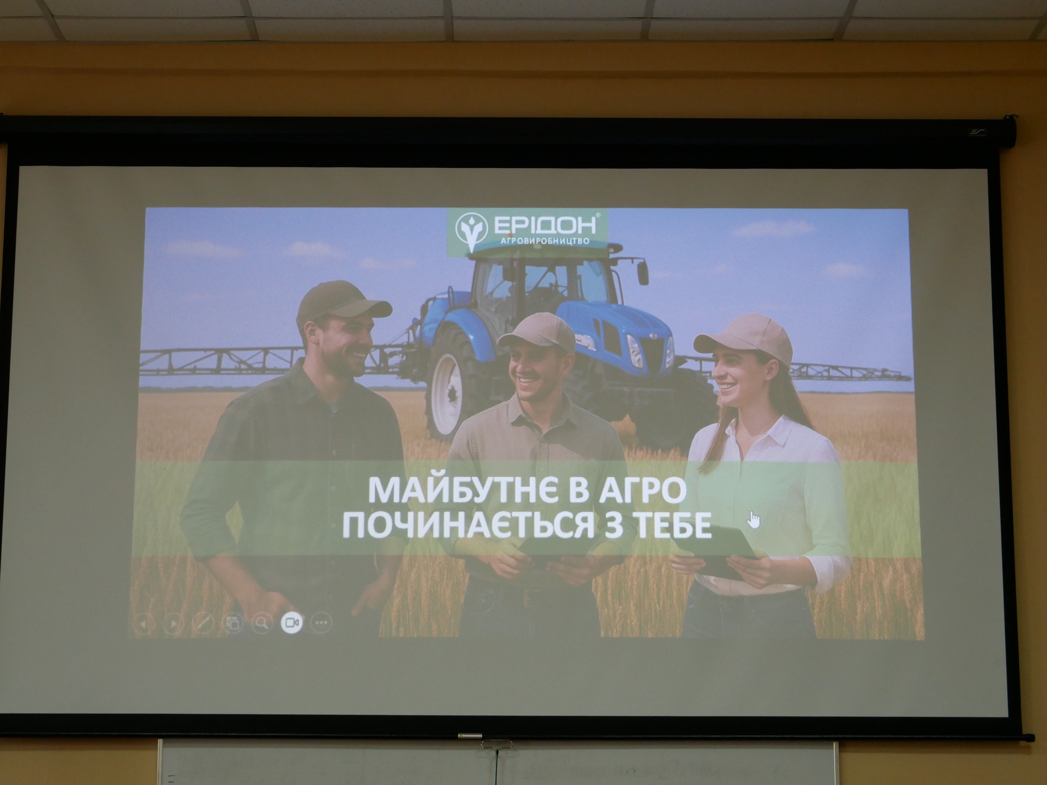 Під час зустрічі пані Ольга ознайомила студентів з можливостями професійного розвитку, яку пропонує компанія, зокрема щодо розвитку дуального навчання та участі у програмі «Агро майбутнє з Ерідон Агро». У межах програми можливе проходження стажування, що передбачає наставництво фахівців компанії та є першим кроком для подальшого працевлаштування на вакантні посади. Окрему увагу приділено соціальним гарантіям, які компанія пропонує своїм працівникам: достойне фінансове забезпечення, організація харчування, довезення до робочого місця, компенсація вартості житла.