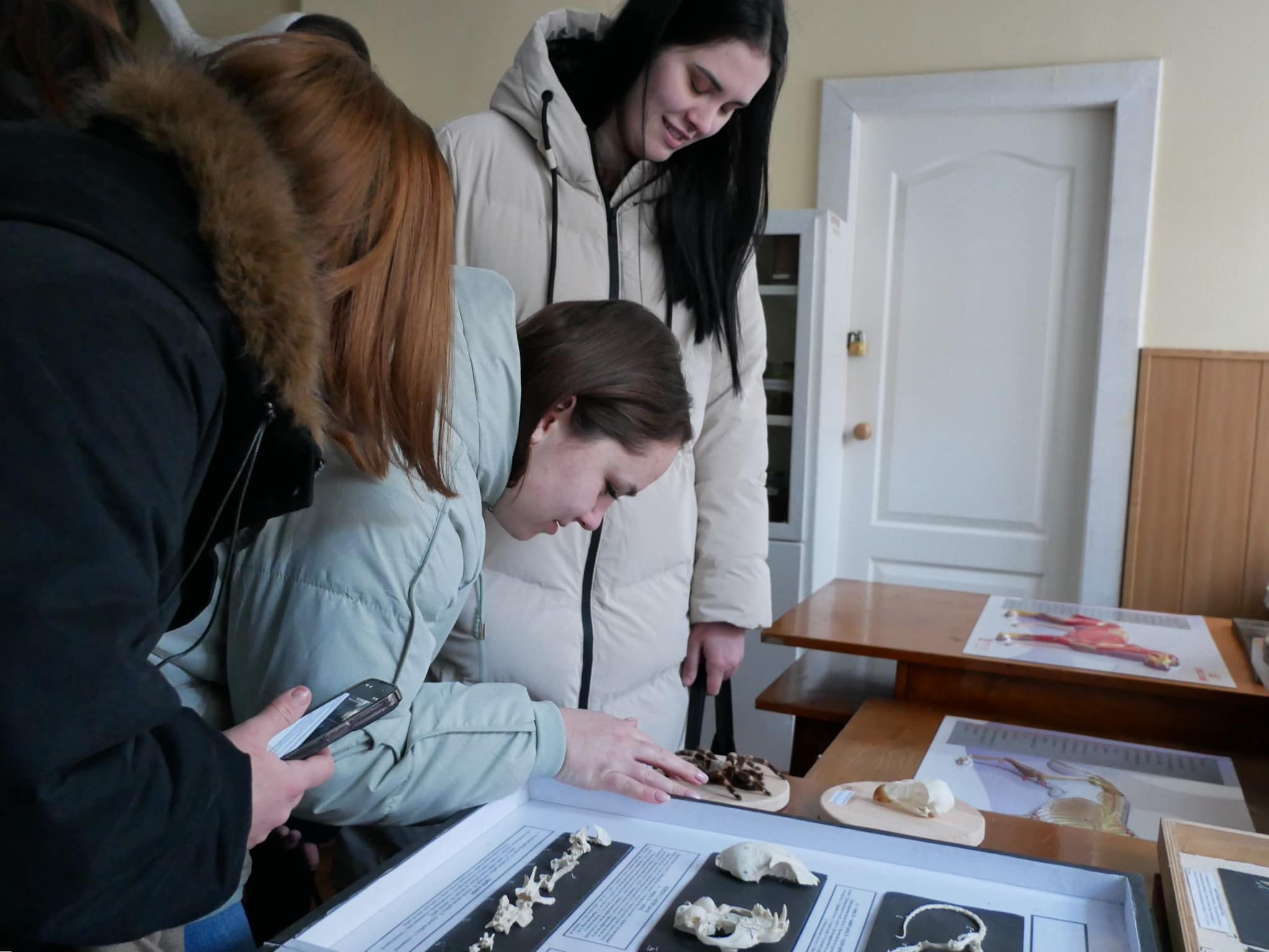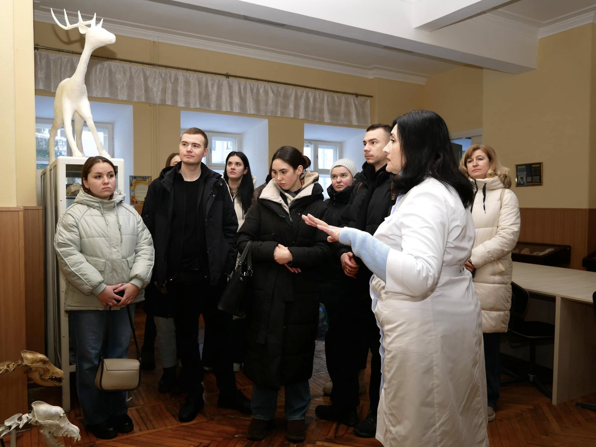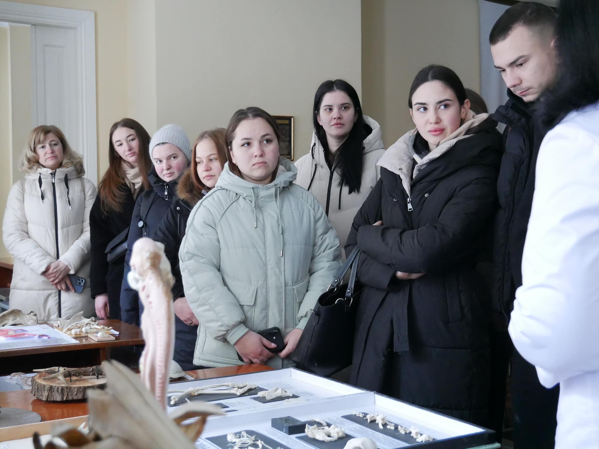 Другу частину зустрічі провела доцентка кафедри нормальної і патологічної анатомії та фізіології тварин Олена Киричко в науково-навчальному анатомічному музеї сільськогосподарських тварин. Студенти-медики ознайомилися з експонатами, що демонструють будову організмів різних видів ссавців, зокрема опорно-рухової, серцево-судинної і нервової систем.