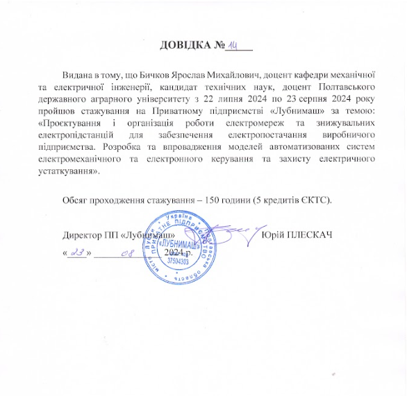 2. Приватне підприємство «Лубнимаш», довідка про стажування № 14, «Проєктування і організація роботи електромереж та знижувальних електропідстанцій для забезпечення електропостачання виробничого підприємства. Розробка та впровадження моделей автоматизованих систем електромеханічного та електронного керування та захисту електричного устаткування», 23.08.2024, 5 кред. (150 год.).