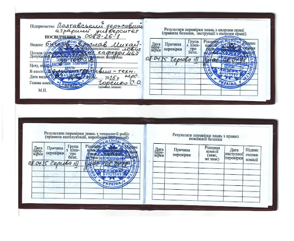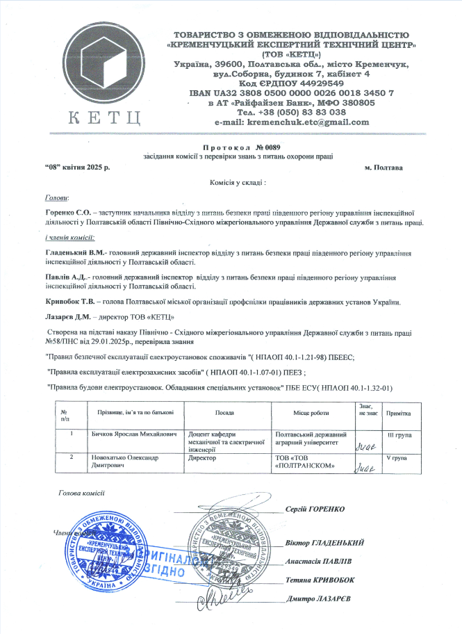 1. Товариство з обмеженою відповідальністю «Кременчуцький експертний технічний центр». Підтвердження допуску ІІІ групи електробезпеки, посвідчення № 0089-26-1, «Безпечна експлуатація та технологія робіт з електроустановками до 1000 В», 1 кред. (30 год).