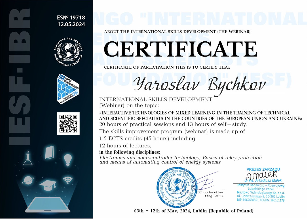 03.05.2024 - 12.05.2024 - навчання за програмою підвищення кваліфікації, Instytut Badawczo-Rozwojowy Lubelskiego Parku Naukowo Technologicznego Sp. z o. o. (Lublin, Republic of Poland), ГО «Міжнародна фундація науковців та освітян» (IESF) (Київ, Україна), «Інтерактивні технології змішаного навчання при підготовці здобувачів освіти технічних та природничих спеціальностей в країнах європейського союзу та Україні». Сертифікат ESN №19718 від 12.05.2024. 45 год. (1,5 кредити ЄКТС).