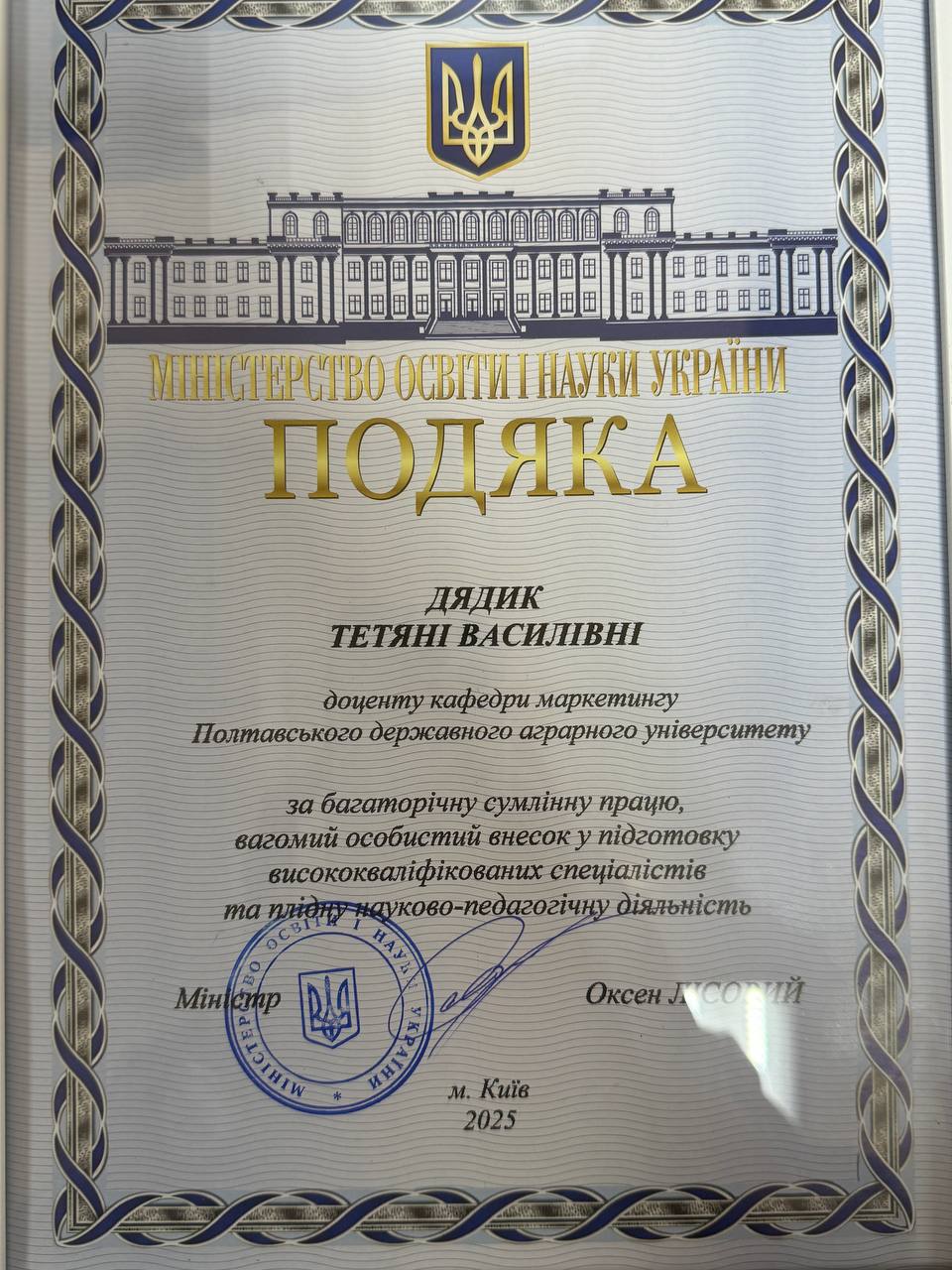 10. Подяка за багаторічну сумлінну працю, вагомий особистий внесок у підготовку висококваліфікованих спеціалістів та плідну науково-педагогічну  діяльність, Міністерство освіти і науки України, 2025 р.