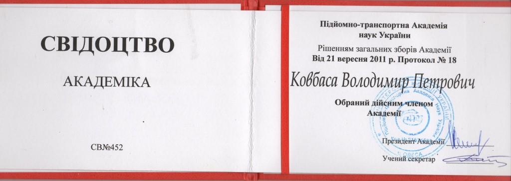 Академік піднімально-транспортної академії наук Україні, Диплом СВ№452, від 21.09.2011 р.