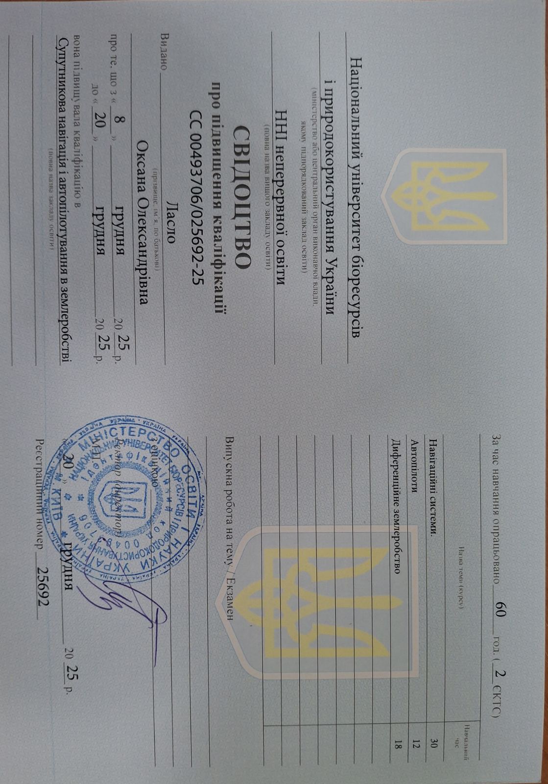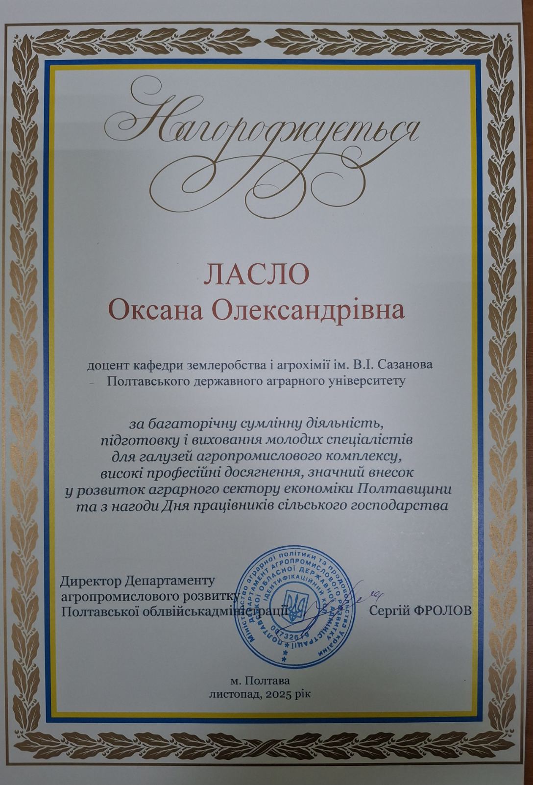 Грамота за багаторічну сумлінну діяльність, підготовку і виховання молодих спеціалістів для галузей агропромислового комплексу, високі професійні досягнення, значний внесок у розвиток агропромислового сектору економіки Полтавщини та з нагоди Дня працівниківсільського господарства, 2025 рік