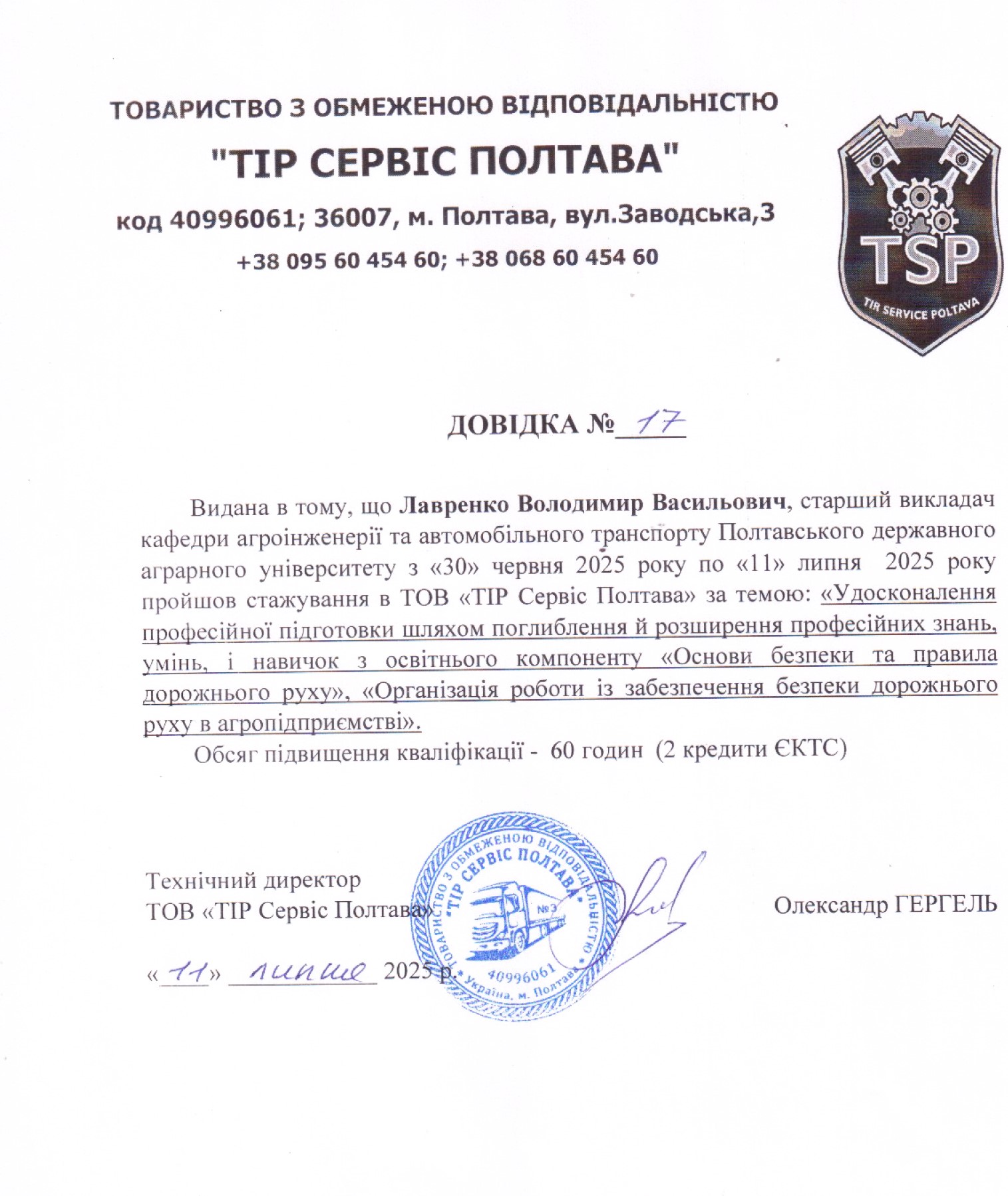 - ТОВ "Авто-Моторна Компанія". «Інноваційні технології та передовий досвід з застосування сучасних технологій та обладнання при ремонті і обслуговуванні автомобільного транспорту для забезпечення безперервності технологічних процесів в АПК» з 01.08.2024р. по 12.08.2024р. 60 год. (2 ЄКТС)