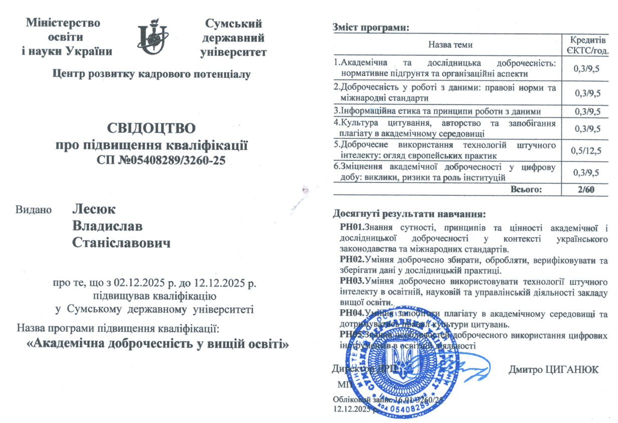 | 02.12.2025-12.12.2025 | Сумський державний університет, Центр розвитку кадрового потенціалу. Курс "Академічна доброчесність у вищій освіті". Сертифікат №05408289/3260-25 від 12.12.2025. 60 год. (2 кредити ЄКТС). |
