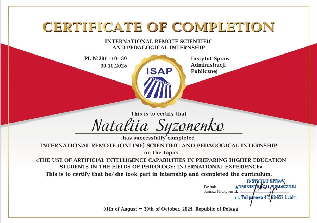 2025 р. - IESF Інститут справ адміністрації публічної (м. Люблін, Республіка Польща) Тема міжнародного дистанційного стажування: “Використання можливостей штучного інтелекту при підготовці здобувачів вищої освіти спеціальності філологія: міжнародний досвід”. Загальний обсяг - 180/6 кредитів, сертифікат PL № 291-10-30 від 30.10.2025.
