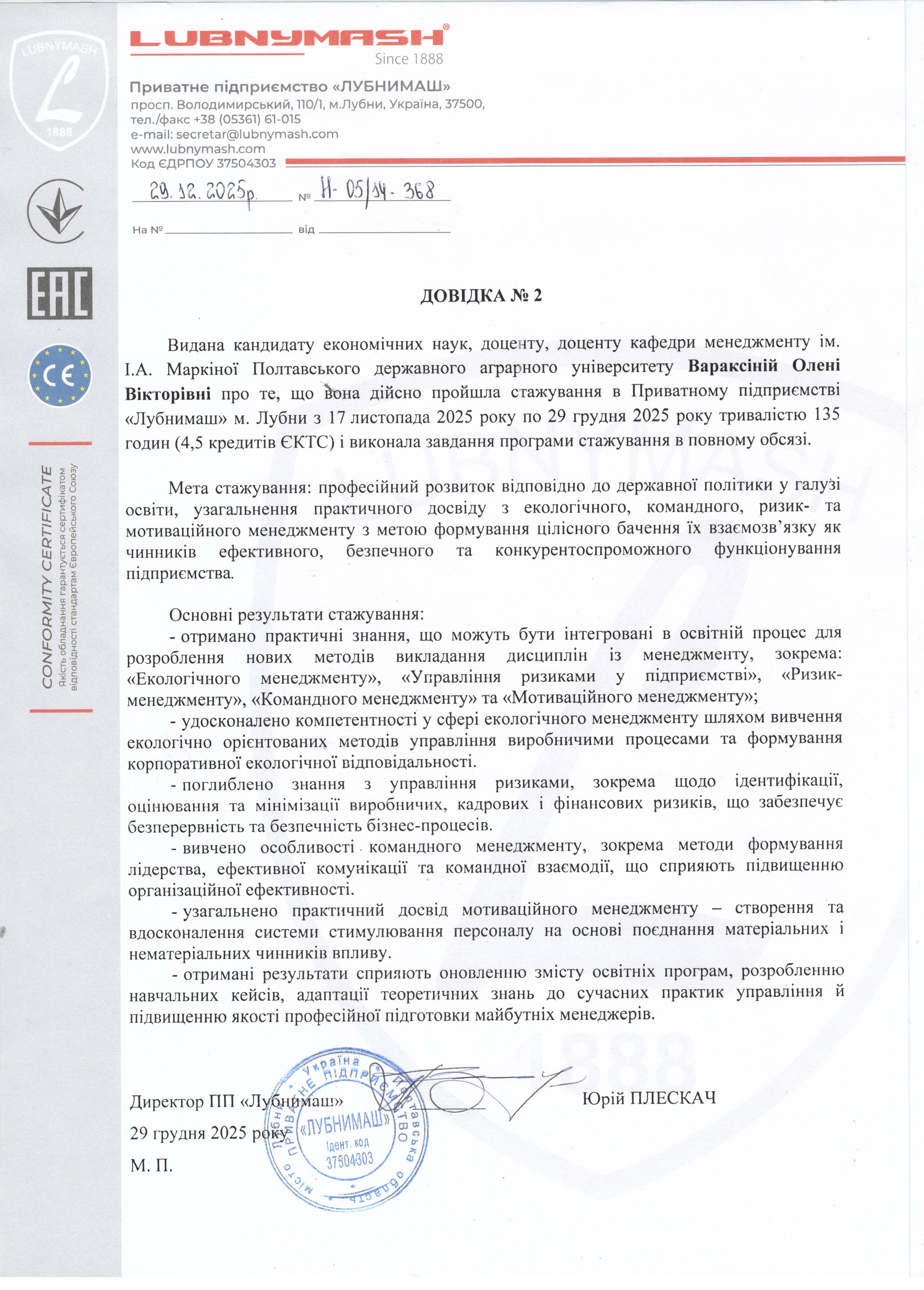 - З 17.11.2025 р. по 29.12.2025р. / Форма: інституційна; вид: стажування у ПП «Лубнимаш». / «Інноваційні підходи до формування стратегії безпекового розвитку в умовах динамічної економіки» /довідка від 29.12.2025 № 2 /145 годин /4,5 кредити ЄКТС.