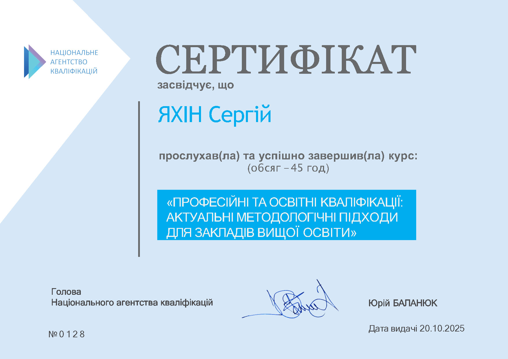 22 вересня 2025 - 17 жовтня 2025 - Тренінговий центр Національного агентства кваліфікацій. Тема: "Професійні та освітні кваліфікації: актуальні методологічні підходи для закладів вищої освіти". Сертифікат 0128 від 20 жовтня 2025 року, 1,5 кред. (45 год).
