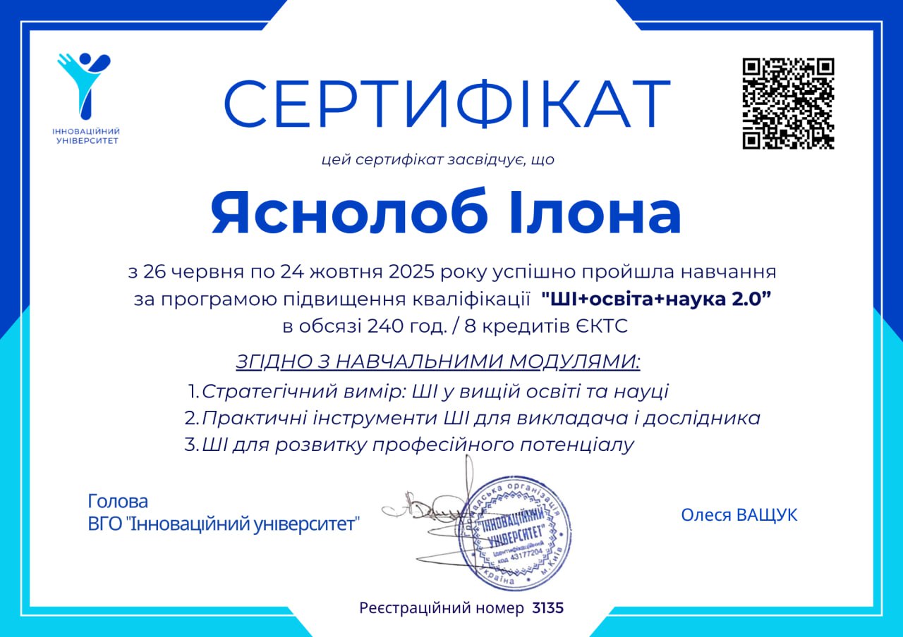 з 26.06.2025 по 30.10.2025 р. - підвищення кваліфікації у  ВГО Інноваційний університет на тему "Літня школа «ШІ + освіта + наука 2.0»: практичне використання штучного інтелекту в освіті та науці". Сертифікат. Обсягом 240 год / 8 кредитів.